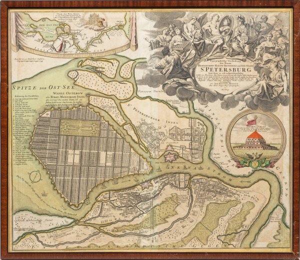 Kolorierter Kupferstich von Johann Baptist Homann, Nürnberg, um 1720. Eine der frühesten Darstellungen der 1703 von Zar Peter dem Großen gegründeten Stadt, mit Nebenansicht der Festung Kronschlot, die Lage der Stadt an der Mündung der Newa sowie einer üppigen, allegorischen Titelkartusche. Darstellung 49,7 cm x 58,7 cm. Rahmen.
