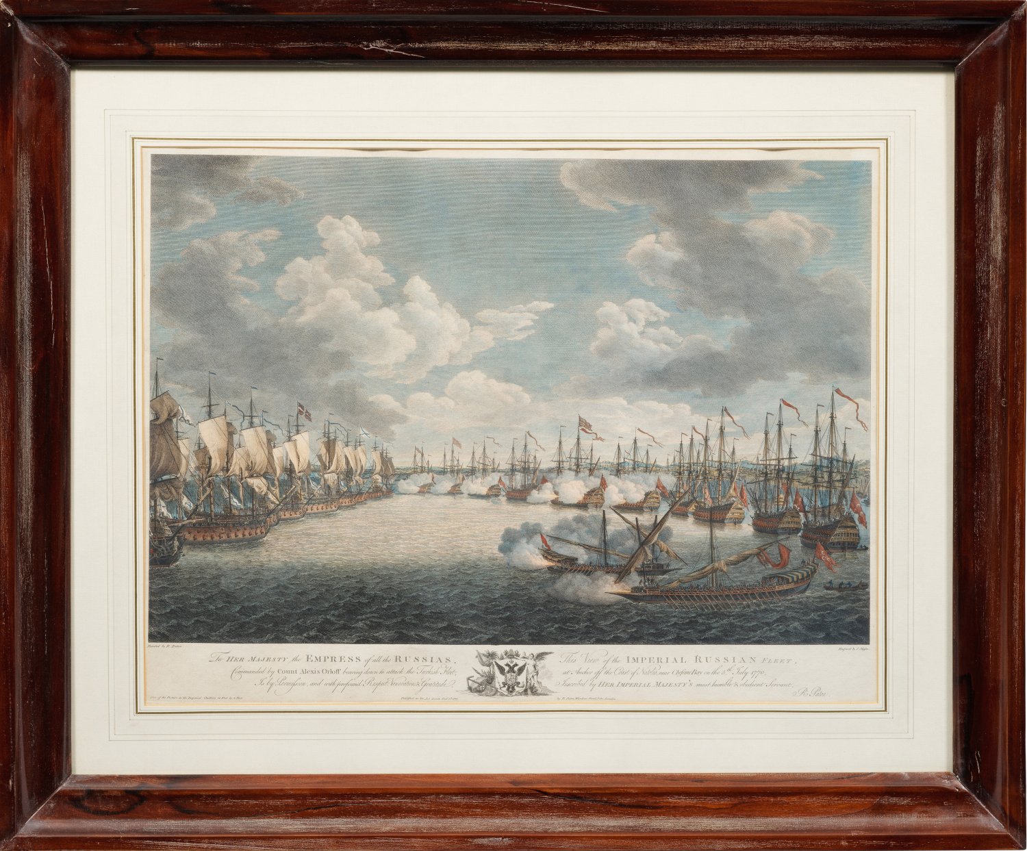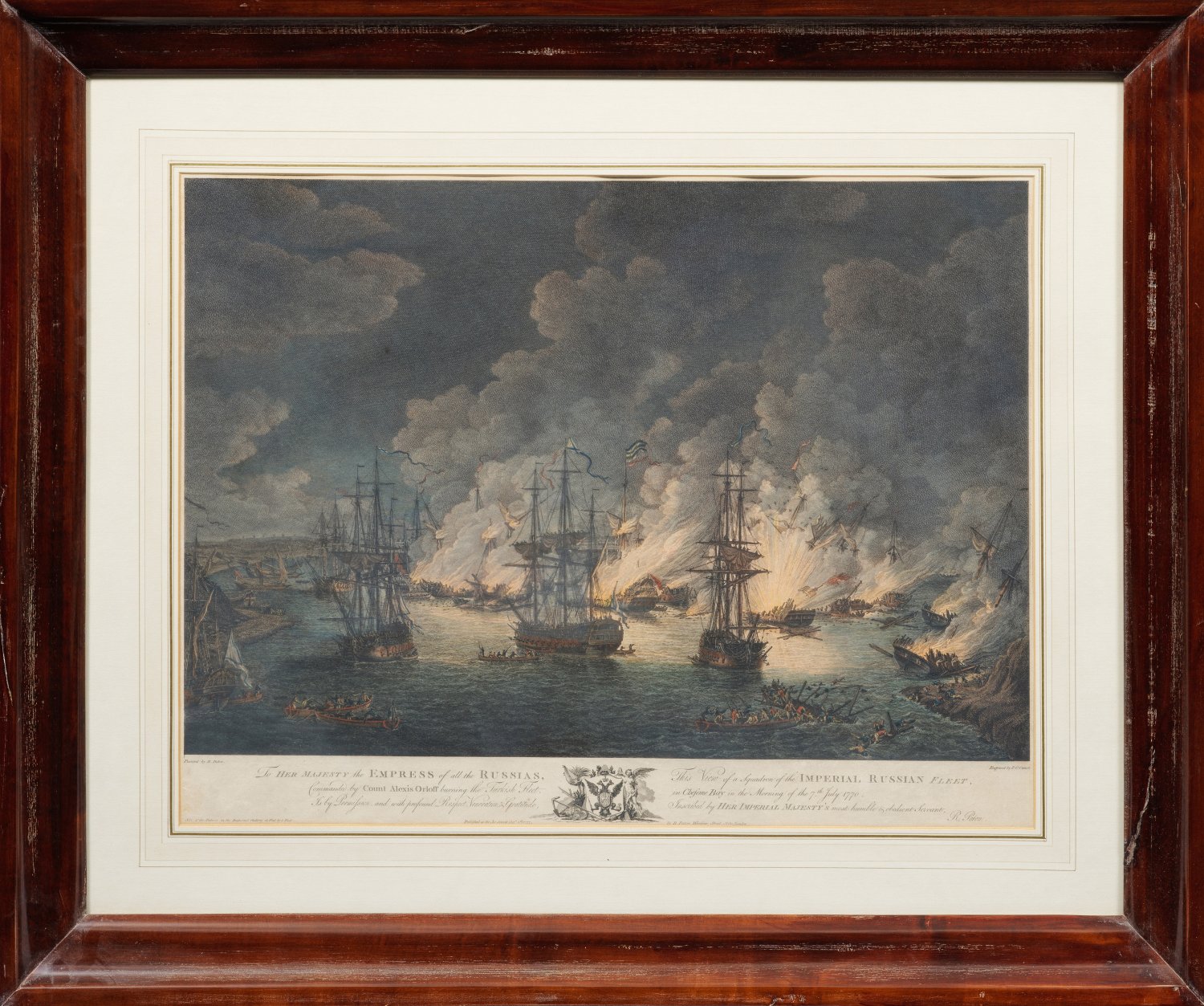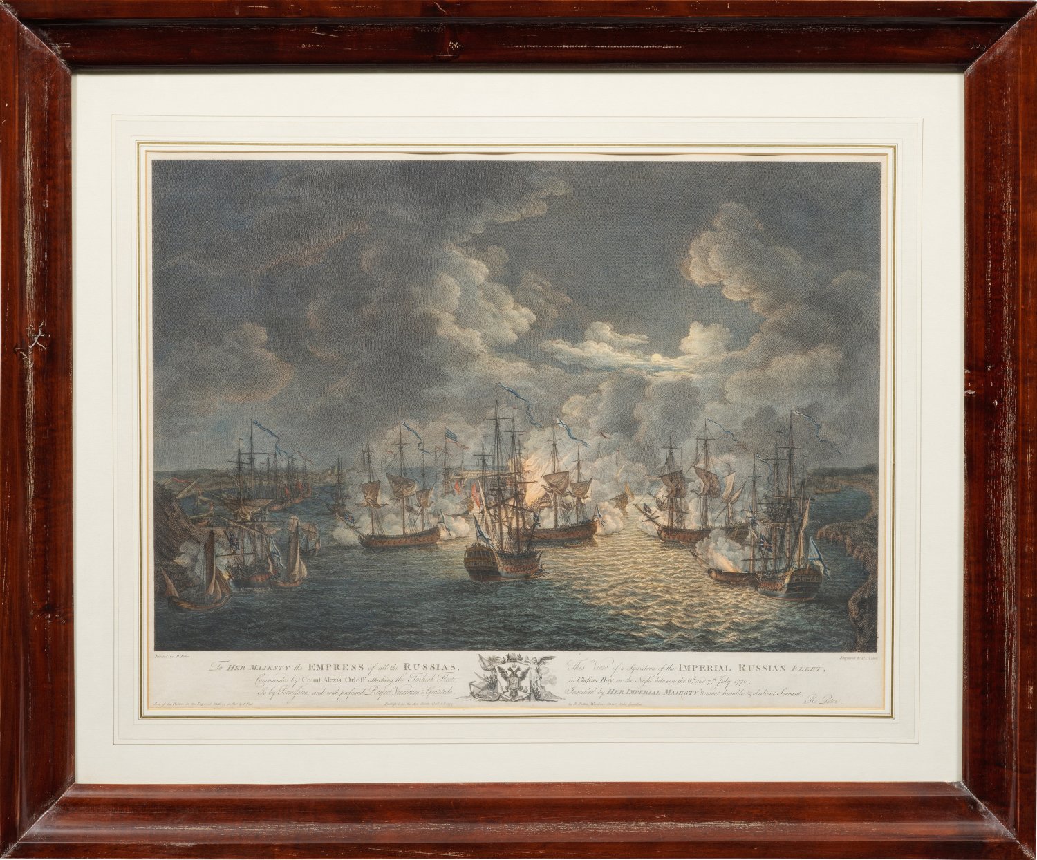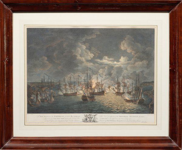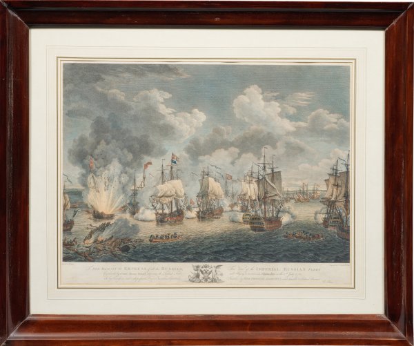 A rare complete series of four hand-coloured engravings and etchings depicting the naval Battle of Cheshme (also the Battle of Chesma or Chesme) on 5-7th July 1770 during the Russo-Turkish War (1768-1774). Engraved by Pierre Charles Cannot (1710 - 1770), James Mason (1710 - 1780) und William Watts (1752-1851), published by Richard Paton, London 1777. Each signed, dated and inscribed on the plate.