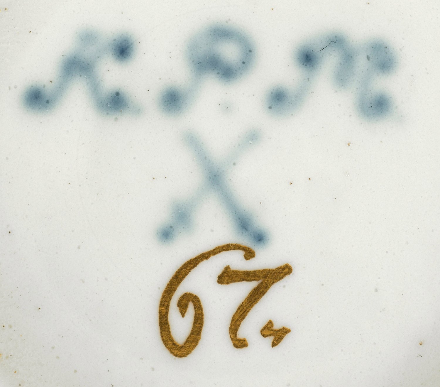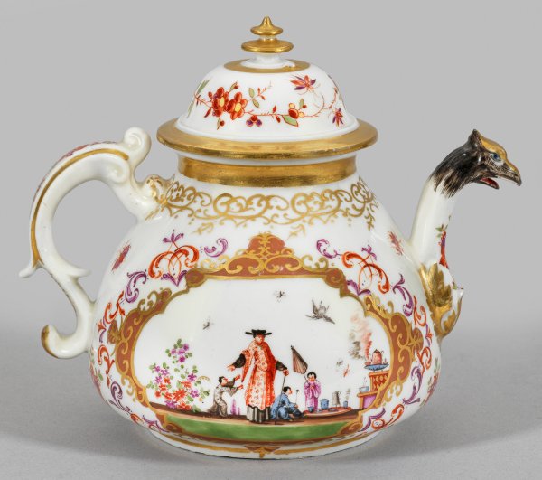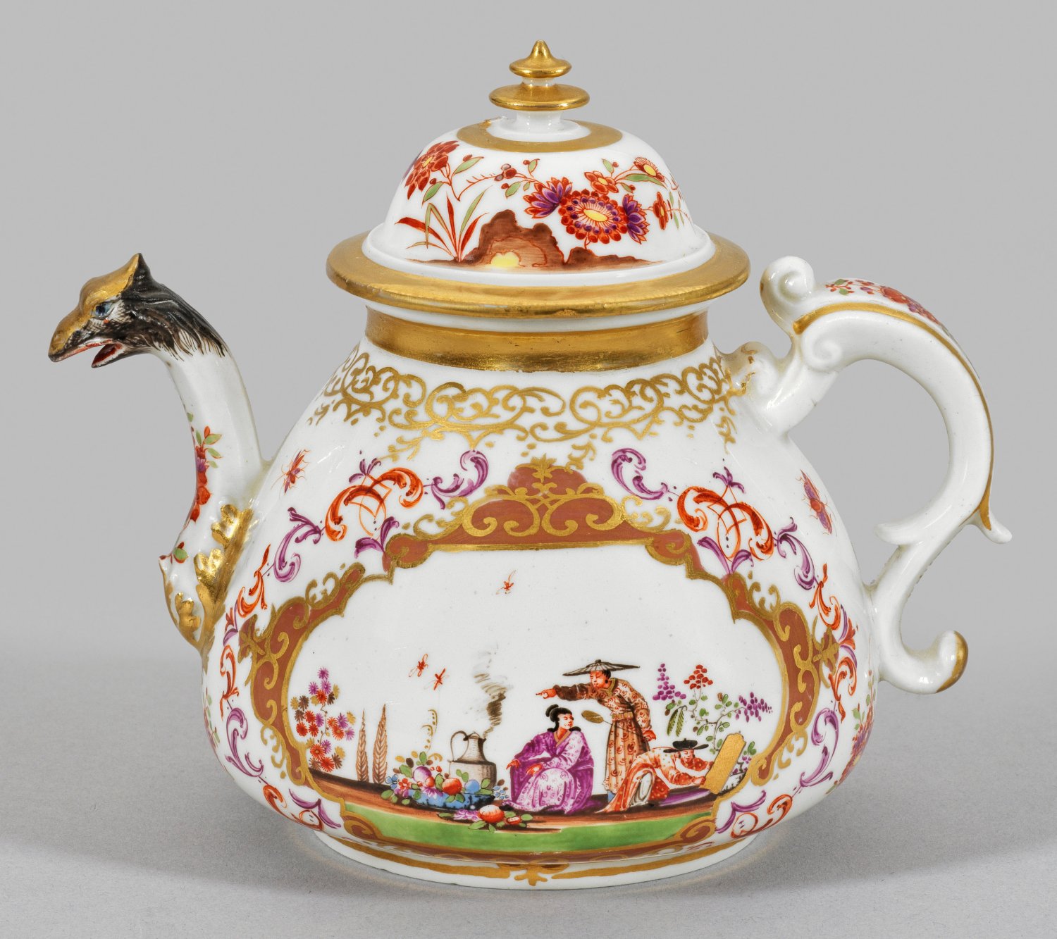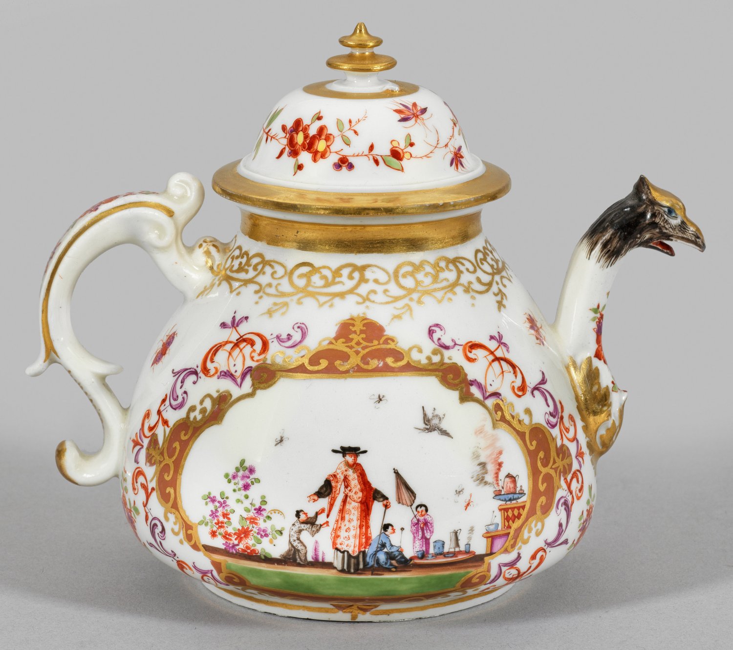Auf kurzem Standring gebauchter, sich nach oben verjüngender Korpus mit ausgestelltem Rand. Seitlicher, volutenförmiger Henkel mit Indianischen Blüten, stilisierten Blattansätzen sowie gebogter, aus einem Tierkopf aufsteigender Röhrenausguss. Haubenförmiger Deckel, mittig hochgezogener Pagodenknauf. Beidseitig der Wandung goldornamentierte, von eisenrotem und purpurfarbenem Laubwerk gerahmte Reserven mit Lüsterfond. Darin sog. Hoeroldt-Chinoiserien mit szenischer Darstellung von Chinesen bei der Teezeremonie in blühender Gartenlandschaft. Indianischer Blumendekor auf dem Deckel. Äußerst feine polychrome Malerei von Johann Gregorius Hoeroldt oder Werkstatt. Goldstaffage. Gold-Nr. 67. KPM und Schwertermarke. H. 13,5 cm.