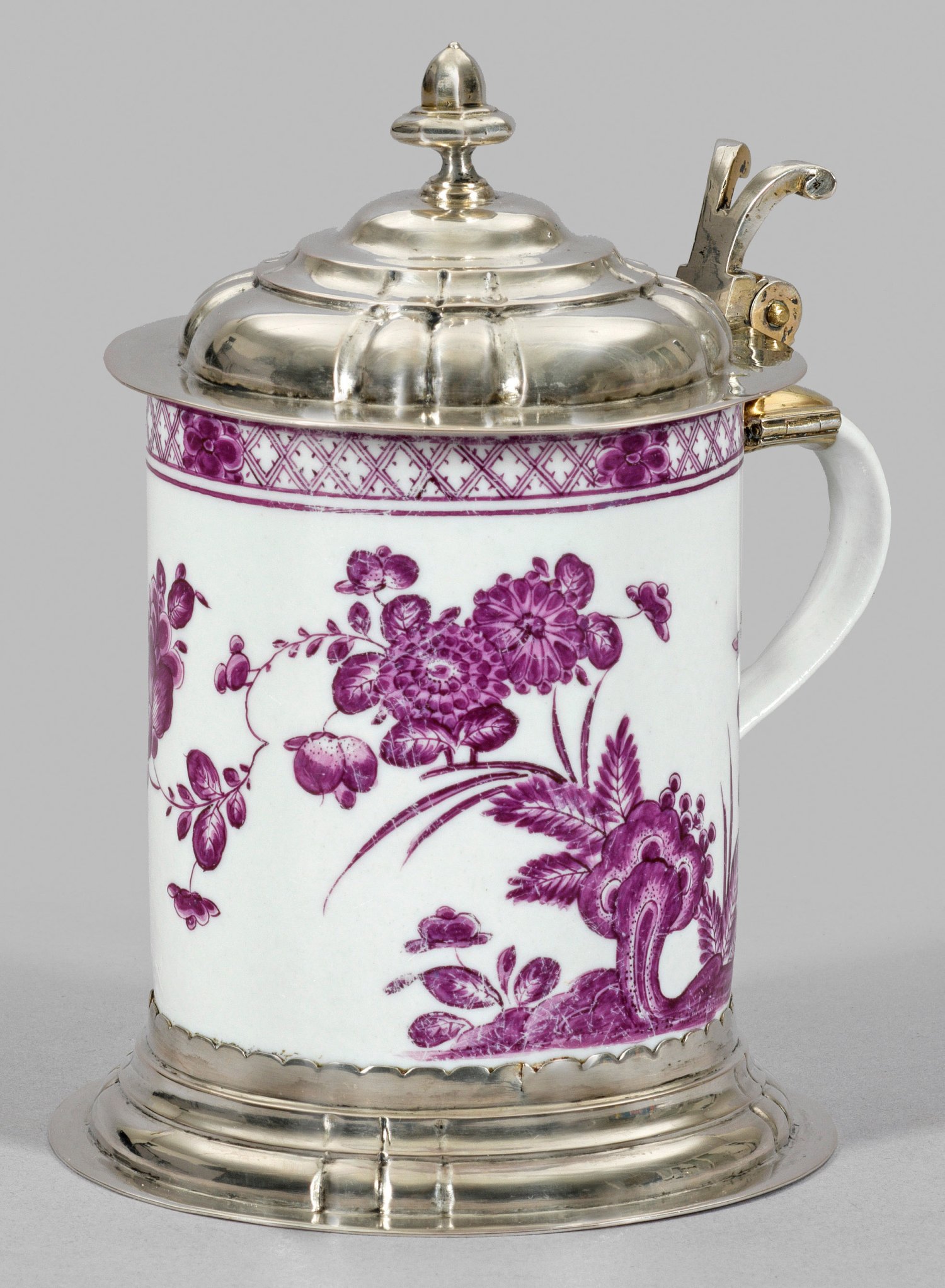 Porzellan mit Silbermontage. Über mehrstufig profiliertem Fuß zylinderförmiger Korpus mit passigem Scharnierdeckel und zweigeteilter Daumenrast. Umlaufend der Wandung Indianischer Dekor aus sich weit verzweigenden, hinter einem Fels emporragenden Päonien- und Chrysanthemenstauden mit fliegendem Vogel. Oberhalb ornamentale Bordüre. Purpur-Camaieumalerei. Tremolierstrich. Beschauzeichen Augsburg. Ungedeutetes Meisterzeichen "MTE". Ber.; Blasse Schwertermarke. H. 14 cm.