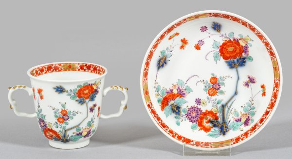 auf Unterschale. Becherförmiger, konisch ansteigender Korpus auf kurzem Standring mit leicht ausschwingendem Rand. Seitlicher Doppelhenkel aus gegenläufigen C-Bögen. Beidseitig der Wandung und im vertieften Spiegel feiner Kakiemondekor aus emporwachsenden Päonien- und Chrysanthemenzweigen in unterglasurblauer, in Gold gehöhter Malerei, überdekoriert in Eisenrot, Purpur, Seegrün und etwas Gelb. Umlaufende Innenwandbordüre aus Blattranken im Wechsel mit einzelnen Blüten. Außenwandung der Unterschale mit Blütenzweigen. Unterschale mit Former- und Dreherzeichen für Christian Meynert (tätig ab 1733) bzw. Blaumalerzeichen am Standring. Minim. rest.; Schwertermarke. H. 6,5 cm.