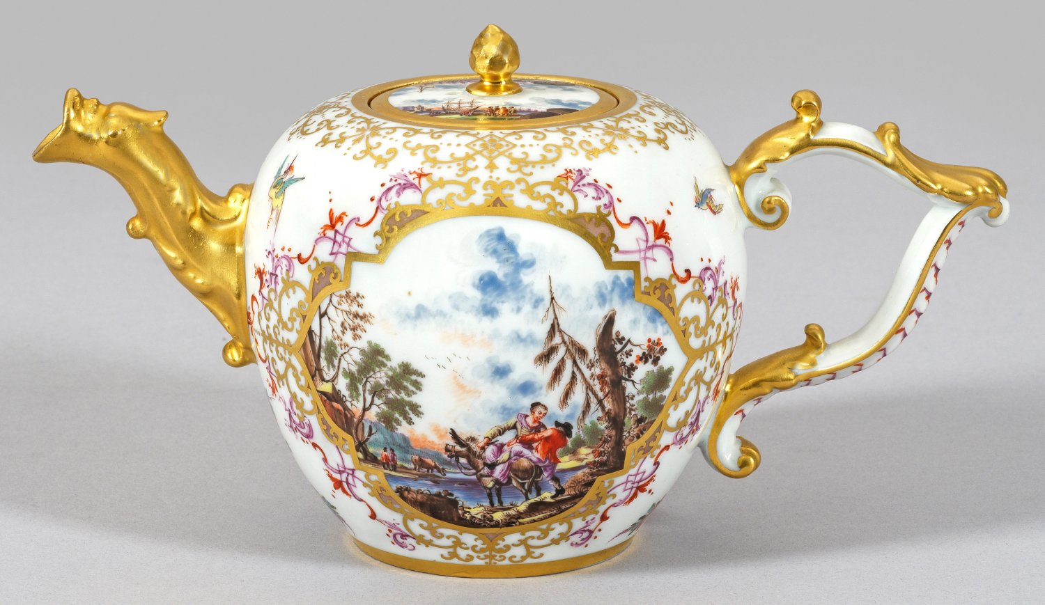 Gedrückte Kugelform mit Tierkopfausguss und J-förmigem Laubwerkhenkel mit Muschelrelief. Bündig aufliegender Deckel mit Pinienknauf. Im Spiegel vierpassige, von Laub- und Bandelwerk gerahmte Goldornamentreserven, mit Böttgerlüster. Darin unterschiedliche, weitläufige Architektur- und baumbestandene Landschaftsszenen mit Reitern vor Gewässern und wolkigem Himmel. Die Schulter mit Goldspitzenbordüre und exotischen Vögeln. Seitlich korrespondierende Stauden mit Kakiemonblüten. Auf dem Deckel figurenreiche Kauffahrteiszenen. Feine polychrome Malerei wohl von Johann Georg Heintze. Gold- und Glanzgoldstaffage. Dreherzeichen für Johann Christian Dietrich. Schwertermarke. H. 12 cm.