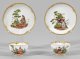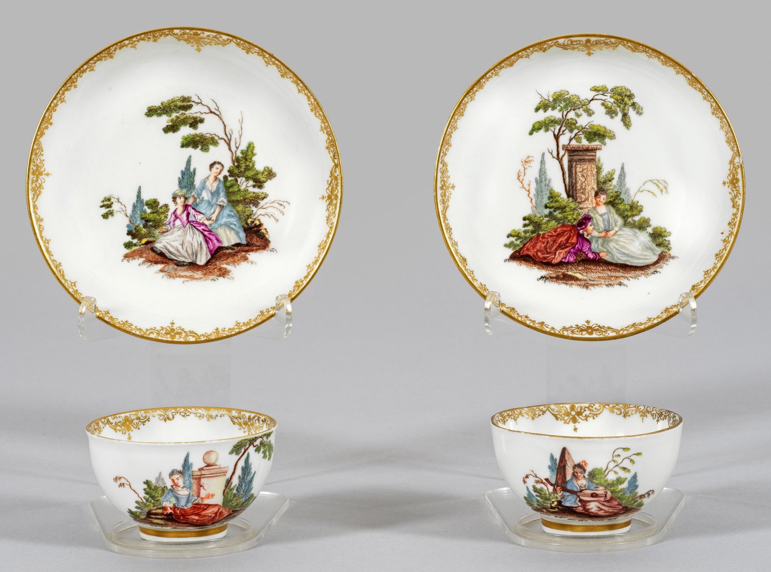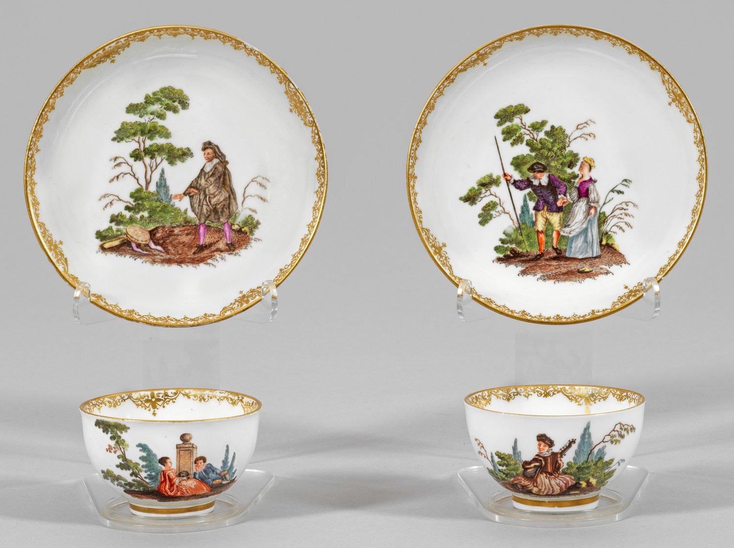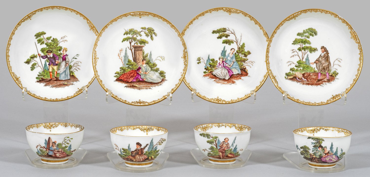 Four porcelain tea bowls and saucers finely painted with Watteau and theatrical figures from the Commedia dell'arte. Gold letter "S.". Partly former's mark for J. Chr. Schumann (active from 1735). Partly insignificantly restored. Crossed swords mark.