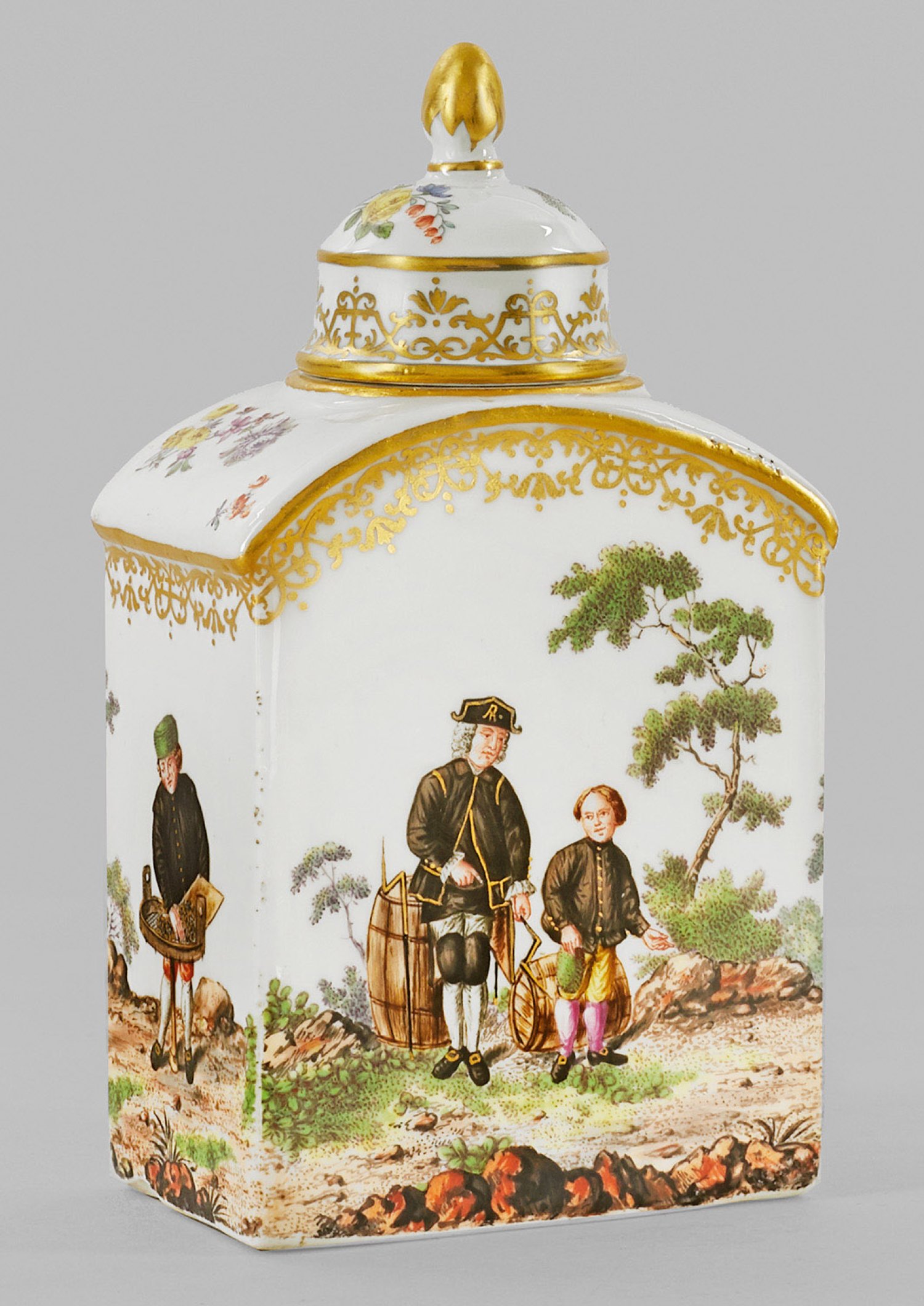 Rechteckiger Korpus mit abgerundeter Schulter und kurzem, zylindrischem Hals. Übergreifender Deckel mit stilisiertem Pinienknauf. Auf der Wandung unterschiedliche Szenen aus dem Leben der sächsischen Bergleute. Schauseitig, in felsiger, baumbestandener Landschaft, zwischen Fässern stehender Bergbeamter bei der Unterweisung eines Pochjungens, rückseitig dargestellte Bergleute beim Abladen des Erzgesteins. Auf den Schmalseiten ein Bergmann beim Verteilen des Gesteinshaufens mit einem Rechen bzw. beim Reinigen mit einem Sieb. Auf der Schulter kleine, farbige Blumenbuketts. Polychrome Malerei wohl von Bonaventura Gottlieb Häuer (1710 - 1782). Formerzeichen für Johann Daniel Rehschuh (tätig ab 1723) oder Johann Christoph Pietzsch (tätig ab 1732). Deckel erg.; Alte, verschliffene Best.; Schwertermarke. H. 13 cm.