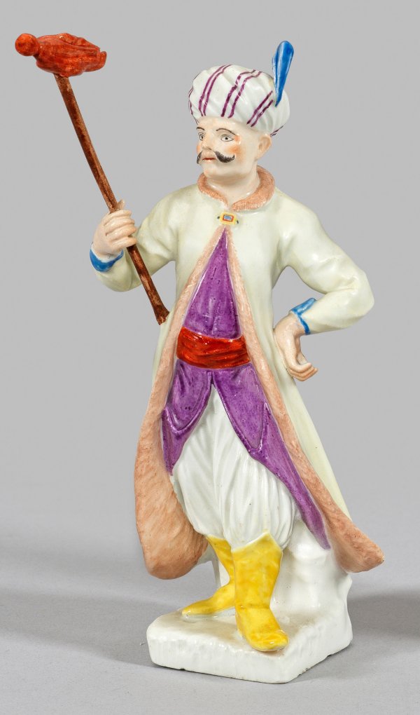 Auf einem Rechteckssockel im Kontrapost stehender Sultan mit Fahne. Polychrome Malerei. Entw. Johann Friedrich Eberlein, Johann Joachim Kaendler und Peter Reinicke. Als ursprünglicher Auftraggeber fungierte Heinrich Graf von Brühl. Rest.; Schwertermarke. H. 16,5 cm.