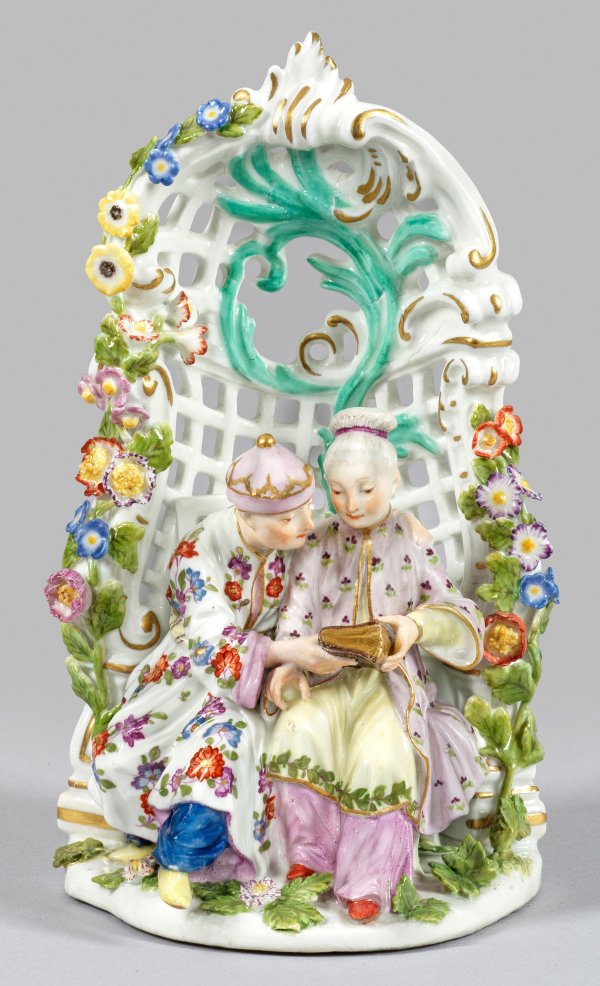 Unregelmäßiger, mit Blüten und Blättern belegter Sockel. Vor gitterförmig durchbrochen gearbeiteter, mit plastischen Blütenranken umzogener Laube ein junges, sitzendes Paar, in ihren Händen ein Buch haltend. Entw. Peter Reinicke, um 1750. Polychrome Malerei mit Goldstaffage. Minim. rest.; Ger. Spannungsrisse. Schwertermarke. H. 21 cm.