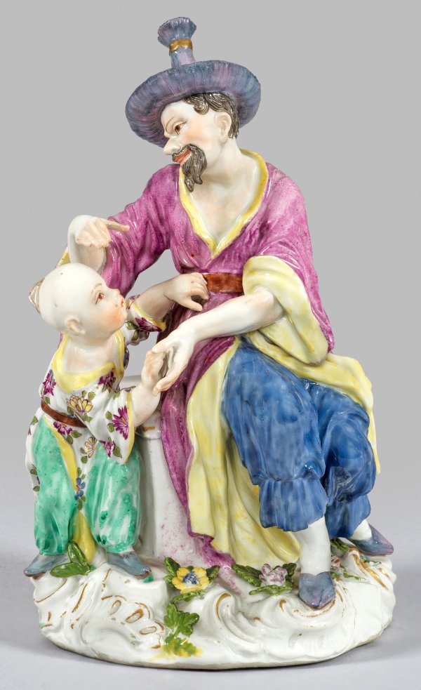 Auf einem mit Blüten und Blättern belegten Rocaillesockel auf einer Bank mit Blumentopf sitzender Asiate mit Pluderhose und weitem Gewand, das zu ihm aufblickende Kind mit Kakiemon geblümtem Kimono festhaltend. Polychrome Malerei mit dezenter Goldkonturierung. Entw. Johann Joachim Kaendler, 1757. Minim. rest.; Schwertermarke. H. 15 cm.