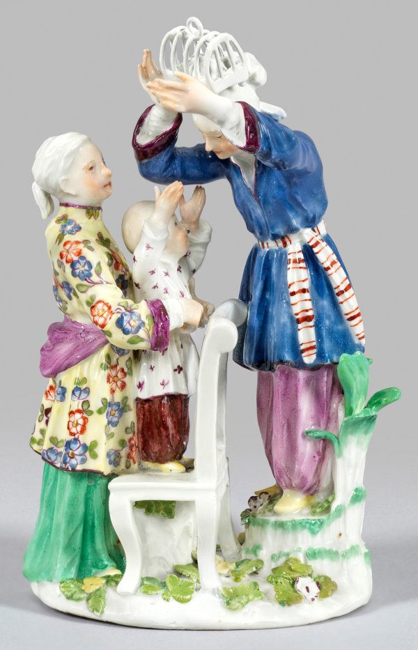 Naturalistisch gestalteter Sockel mit aufgelegten Blüten. Auf einem Palmenbaumstumpf stehende Chinesin, in ihren erhobenen Händen einen Vogelkäfig haltend. Neben ihr auf einem Stuhl sich emporstreckendes Kind, nach dem Vogelbauer greifend. Hinter ihnen stehendes Mädchen, das Kind haltend. Polychrome Malerei. Entw. Peter Reinicke. Unw. rest.; H. 15 cm.