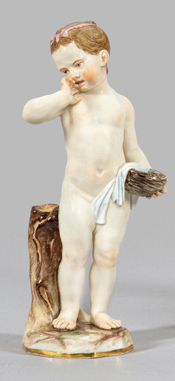 Auf naturalistisch gestaltetem, goldgerändertem Sockel stehendes Mädchen, in der linken Hand ein Nest mit Vogeleiern haltend. Polychrome Malerei. Entw. Johann Carl Schönheit. Modell-Nr. A 78. Schwertermarke. H. 22 cm.