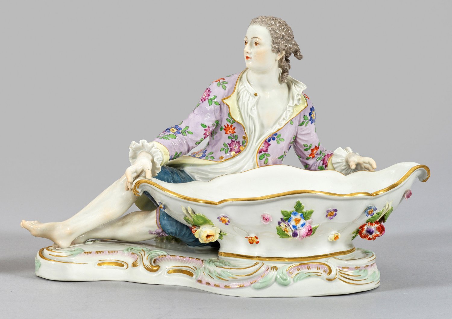 Auf rocaillereliefiertem Sockel liegender junger Kavalier in fliederfarbener, indianisch geblümter Jacke, weißem Hemd und blauer Kniebundhose, mit beiden Händen eine ovale Schale mit passig geschweiftem Rand haltend. Schalenwandungen mit plastisch ausgearbeitetem Blumendekor. Polychrome Malerei mit Goldstaffage. Entw. Johann Joachim Kaendler. Best.; unw. rest.; Schwertermarke. H. 19 cm. L. 29 cm.
