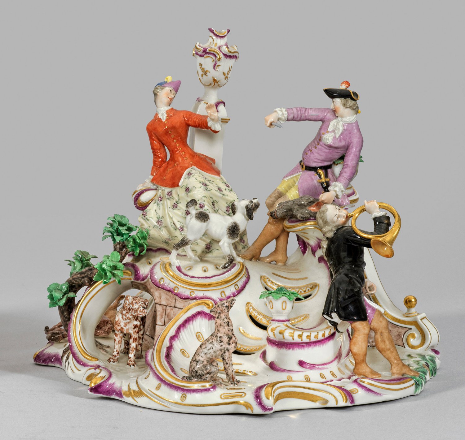 Unregelmäßig, stark rocailllefömig aufsteigender, teilw. durchbrochen gearbeiteter Sockel. Über einem Bau sitzendes, galantes Paar. Die Dame vor einer Säule mit Vasenbekrönung, der Herr mit erlegtem Wildschwein. Umlaufend des Sockels Waldhornbläser, verschiedene Jagdhunde und erlegtes Wild in parkähnlicher Umgebung. Polychrome Malerei. Entw. Franz Anton Bustelli. Minim. rest.; Gepresste Manufakturmarke. H. 28,5 cm. 35 cm x 32 cm.