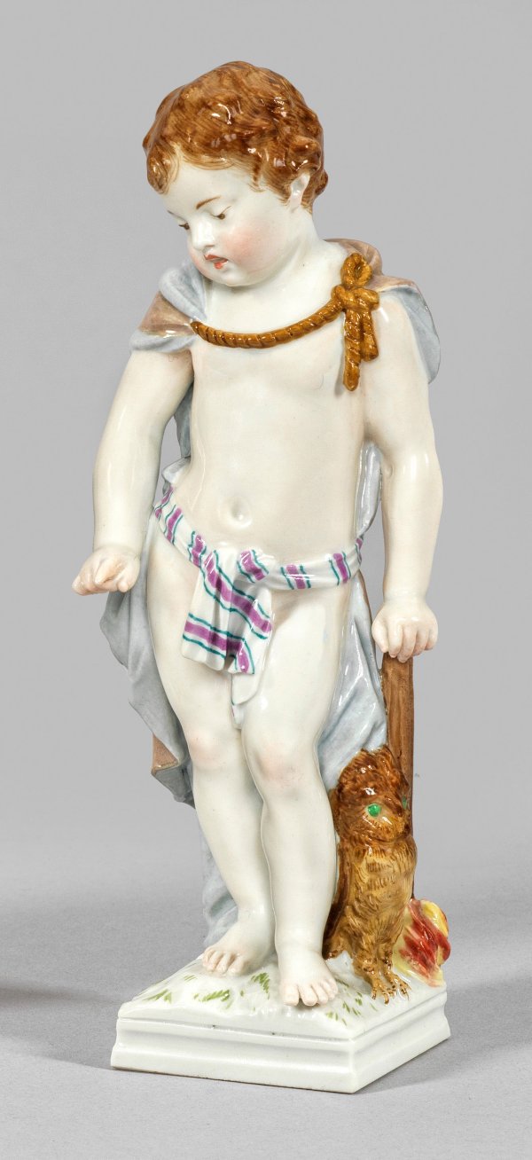 Auf einem quadratischen Sockel, sich auf eine umgedrehte, brennende Fackel stützender Knabe, gehüllt in einen braunen Umhang. Zu seinen Füßen eine Eule hockend. Polychrome Aufglasurmalerei. Entw. um 1780. Modell-Nr. 9707. Minim. rest.; Zepter-, Malerei-, Jubiläums- und Malereimarke. H. 16,5 cm.