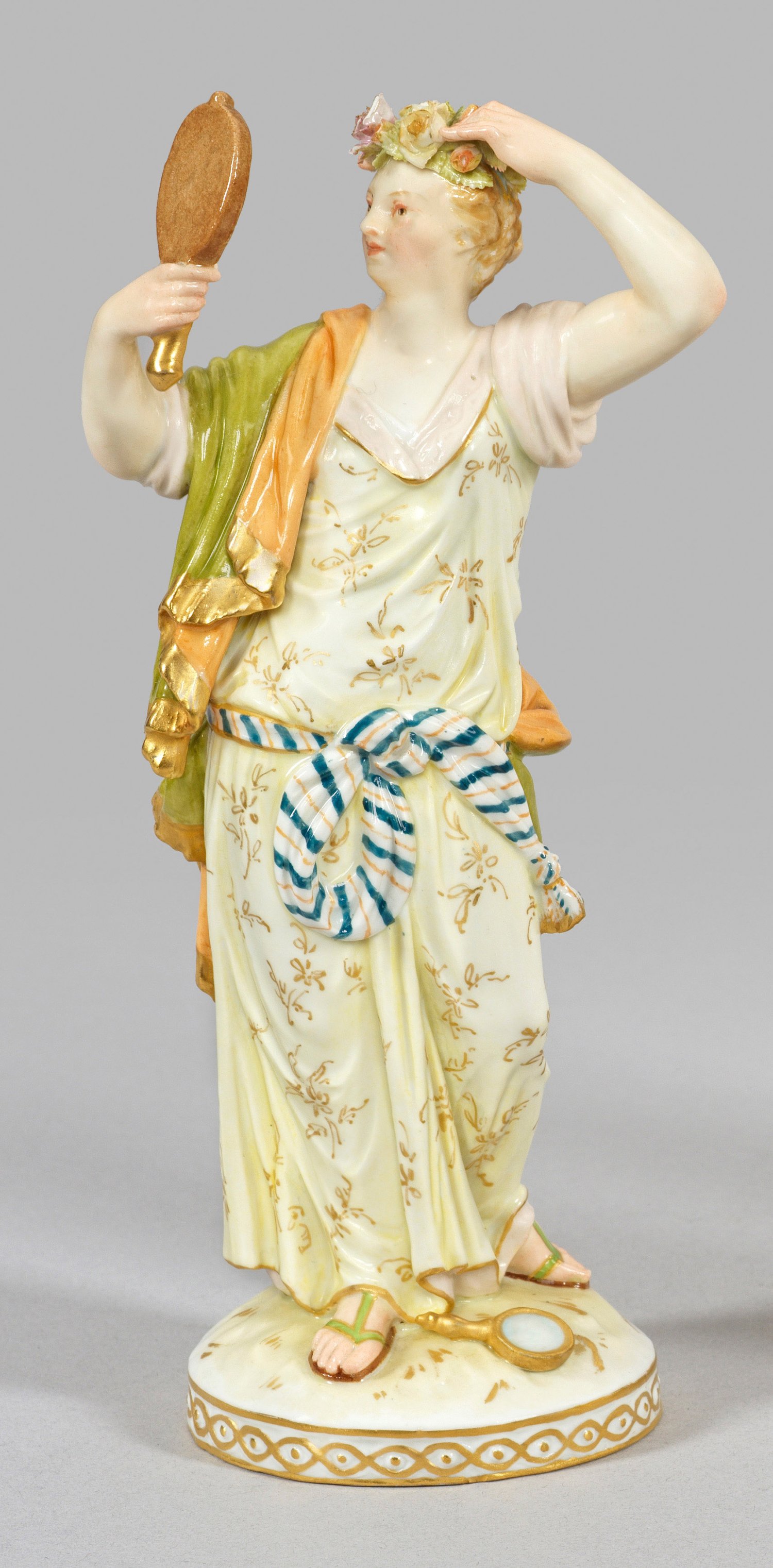 Auf einem ornamental reliefierten Rundsockel die in ein antikisierendes Gewand gehüllte Darstellung "Das Gesicht", einen Blütenkranz tragend und in einen Handspiegel blickend, aus der Serie "Fünf Sinne". Polychrome Malerei mit Goldstaffage. Modell-Nr. 1115. Minim. best.; Malerzeichen. Zepter- und Malereimarke. H. 17 cm.