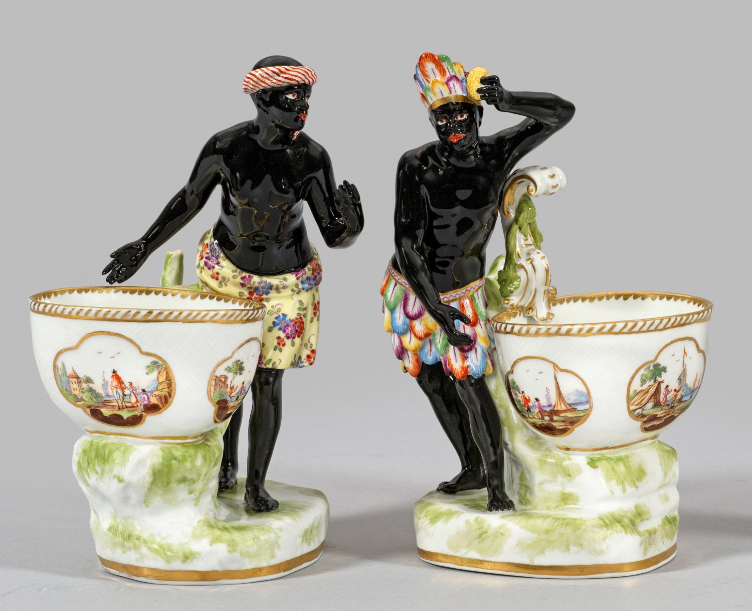 Auf einem Natursockel, am Baumstumpf stehender Mohr mit Lendenschurz und Kopfschmuck aus farbig staffierten Federn als Allegorie Amerikas bzw. Mohrin in blumengemusterter Kleidung und Stirnbinde als Afrika. Seitlich ovales Gefäß. Auf der reliefierten Wandung in vierpassig ausgesparten Reserven gerahmte Kauffahrteiszenen. Polychrome Malerei mit Goldkonturierung. Nach einem Entw. von Johann Joachim Kaendler und Johann Friedrich Eberlein für Meissen. Zeptermarke. H. 18,5 cm.