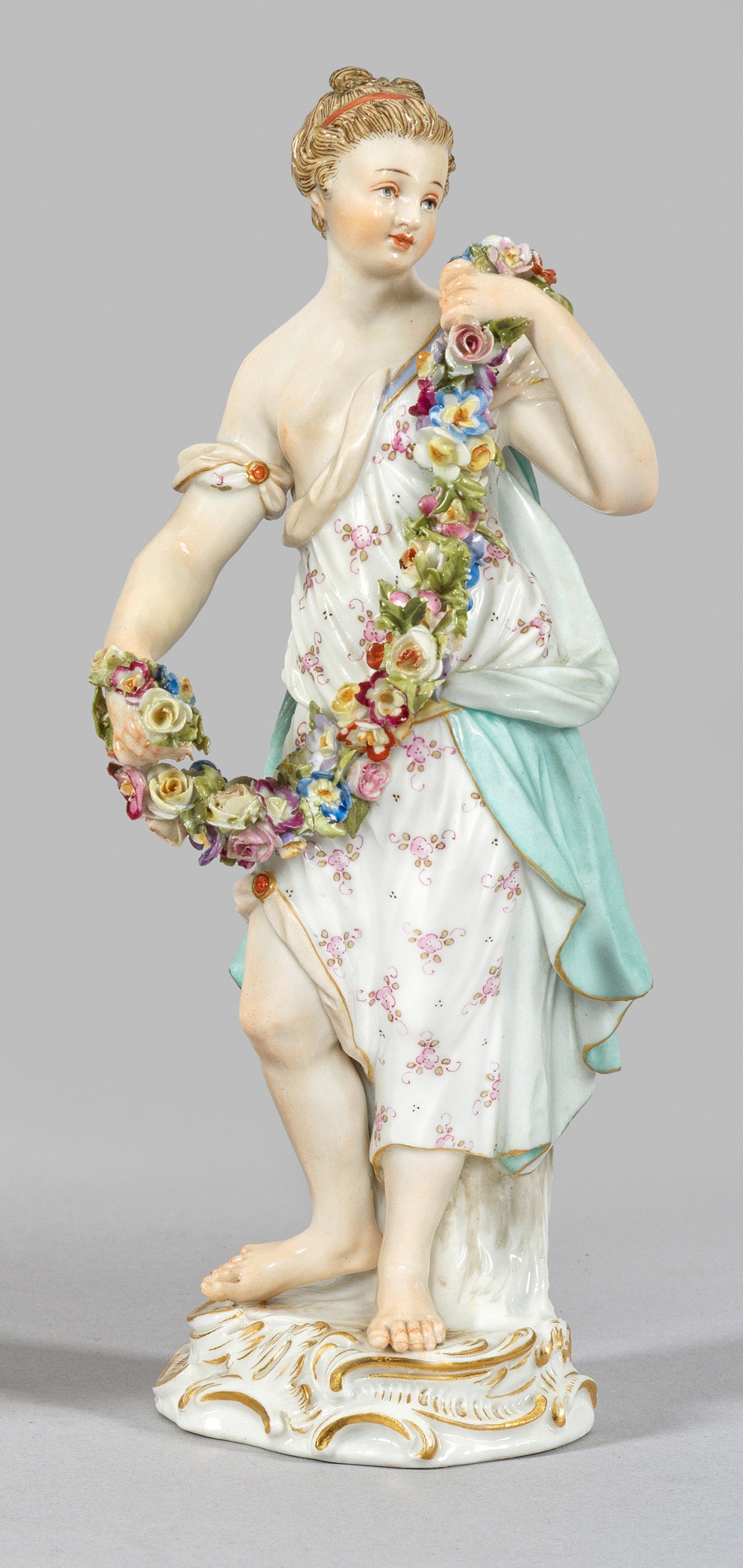 Auf einem Rocaillesockel stehende junge Dame in Blumen gemustertem Kleid mit Umhang, eine Blütengirlande in ihren Händen haltend. Polychrome Malerei mit Goldstaffage. Entw. Johann Joachim Kaendler. Minim. best./rest.; Schwertermarke. H. 19,5 cm