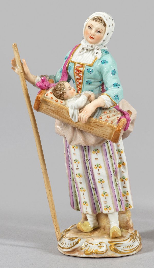 Auf einem Rocaillesockel stehende junge Frau mit Kopftuch und gestreiftem Unterrock unter teils gerafftem Kleid. In ihrer Rechten ein langer Stab, mit ihrer Linken ihr Kind in einer über ihre Schulter gegürteten, tragbaren Wiege haltend. Polychrome Malerei mit Goldstaffage. Entw. Peter Reinicke und Johann Joachim Kaendler. Modell-Nr. 22. Minim. rest.; Schwertermarke. H. 14 cm.