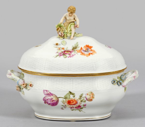 Ovaler, gebauchter, zur Öffnung hin eingezogener Korpus mit passig aufgewölbtem Deckel, bekrönt von einem plastischen Putto, der aus einem Füllhorn Blüten streut. Reliefdekor "Altosier". Auf der Wandung Blumenbuketts und Schmetterling. Seitliche Asthenkel, umzogen von plastischen Blütenranken. Polychrome Malerei mit Goldrand. Malerzeichen. Minim. best.; Zepter- und Malereimarke. L. 33,5 cm. H. 28 cm.