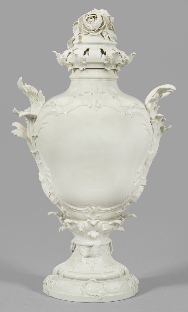 sog. "Schilfvase No. 5". Weißporzellan. Über gestuftem Rundfuß, mit plastischem Blattwerk und Wickelband, balusterförmiger Vasenkorpus mit eingezogenem, kurzen Hals und profiliertem Rand. Aufgewölbter, durchbrochen gearbeiteter Haubendeckel, bekrönt von großem, feinplastisch gearbeitetem Pfingstrosenbukett. Seitlich aufsteigende Schilfbüschel als Handhaben. Unw. best./rest.; Zeptermarke. H. 72 cm.