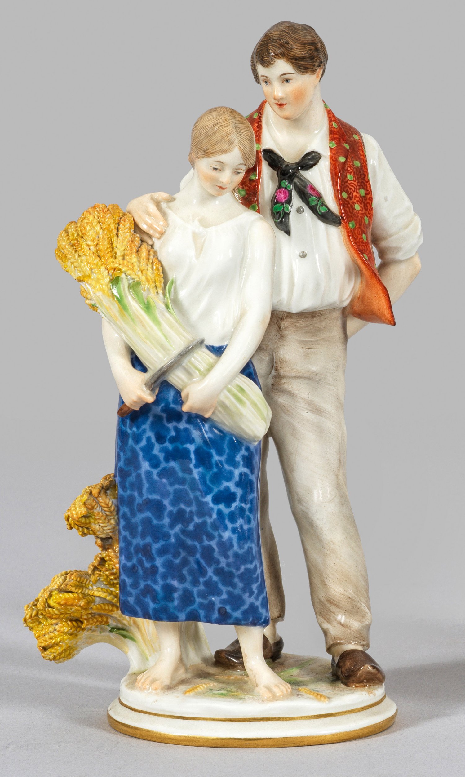 Auf ovalem, profiliertem Sockel ein eng beieinanderstehendes, junges Bauernpaar bei der Ernte. Das Mädchen eine Ährengarbe und die zum Schneiden angesetzte Sichel tragend. Der junge Mann einen Blumenstrauß in der hinter dem Rücken versteckten, linken Hand, während er seine rechte Hand auf ihre Schulter legt. Polychrome Malerei mit wenig Gold. Entw. Gustave Deloy, um 1895/96. Modell-Nr. P 164. Minim. Best.; Schwertermarke sowie Jubiläumsmarke 1710 - 1910. H. 21 cm.