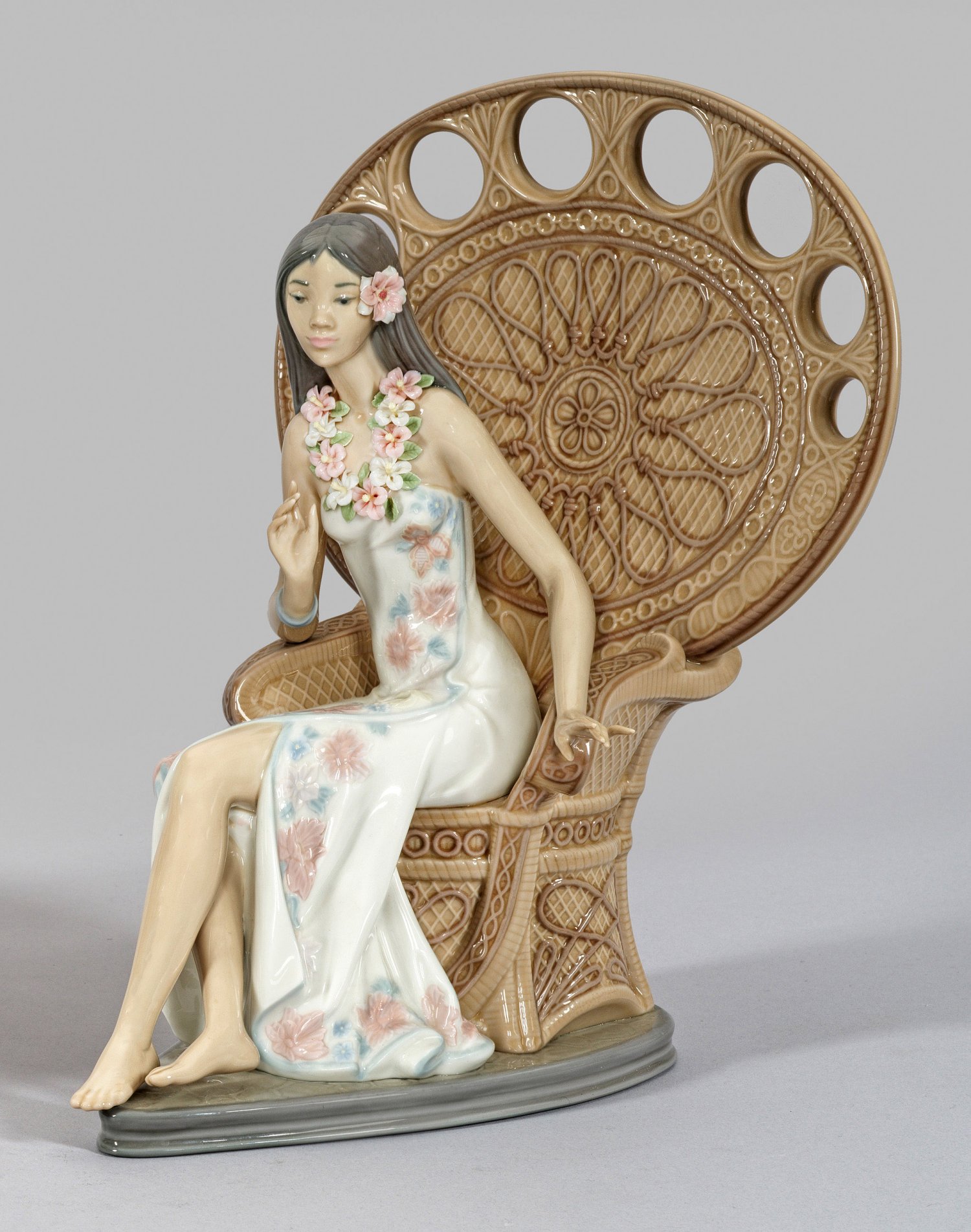A porcelain figure of an enthroned Hawaiian young woman. Manufacturer's mark. Various production-related numbers.
