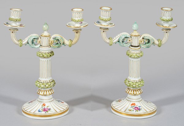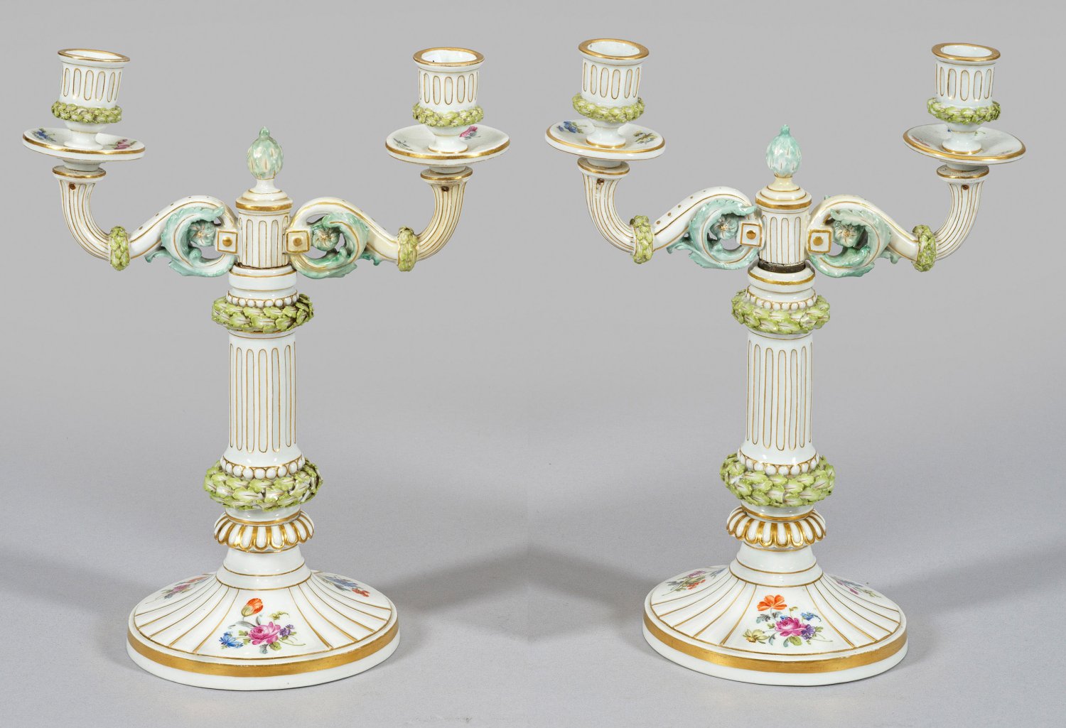 2-flg.; Im Louis-XVI-Stil. Kannelierte Wandung von reliefierten Blattkränzen umzogen. Oberhalb herausnehmbarer zweiflammiger Einsatz, in vasenartigen Tüllen über Traufschalen endend. Polychrome Malerei. Reicher Golddekor. Best.; rest.; Schwertermarke. H. 25,5 cm - 26 cm.