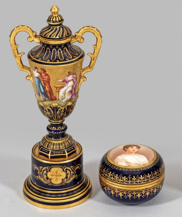 2-tlg.; Vase in Amphorenform, über getrepptem Sockel ovoider Korpus mit seitlichen Ohrenhenkeln. Kobaltfond mit Weißhöhungen. Umlaufend der Wandung vielfigürliche, mythologische Szenen auf vergoldetem, teilw. reliefiertem Grund. "Achilles als Mädchen verkleidet" und "Schönheit krönt die Tugend". Bez. "C. Herr". Dekor im Stil des Wiener Malers Claudius Heer (1775-1838). Deckeldose in gedrückter Kugelform. Kobaltblauer Fond mit Reliefgoldbordüren und ovaler Kartusche mit dem Halbporträt einer jungen Dame. Polychromer Dekor mit reicher Goldstaffage. Deckel der Vase besch.; Manufakturmarke. H. 27 cm.; D. 9 cm.