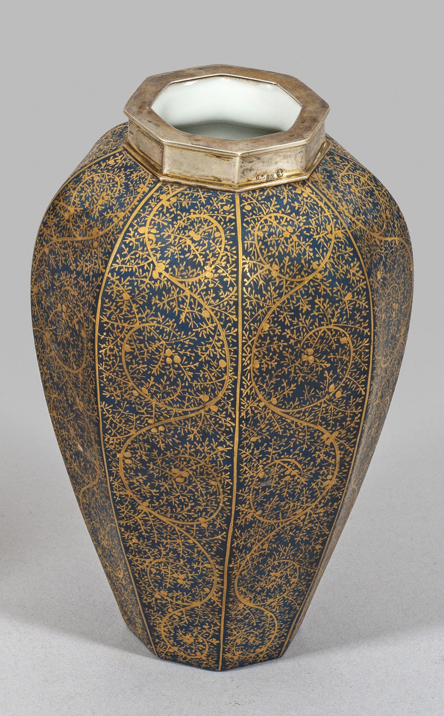 Polygonaler, gestreckt ovoider Korpus mit gerundeter Schulter und passiger Silbermontierung. Mattblauer Fond mit feiner floraler Goldmalerei. Modell-Nr. 854. Malerzeichen. Silbermontierung. Gest. 800. Gebrüder Kühn, Schwäbisch Gmünd, nach 1888. Manufakturmarke. H. 15 cm.