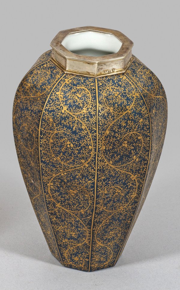 A finely gold painted and silver mounted porcelain vase. Manufacturer's mark.