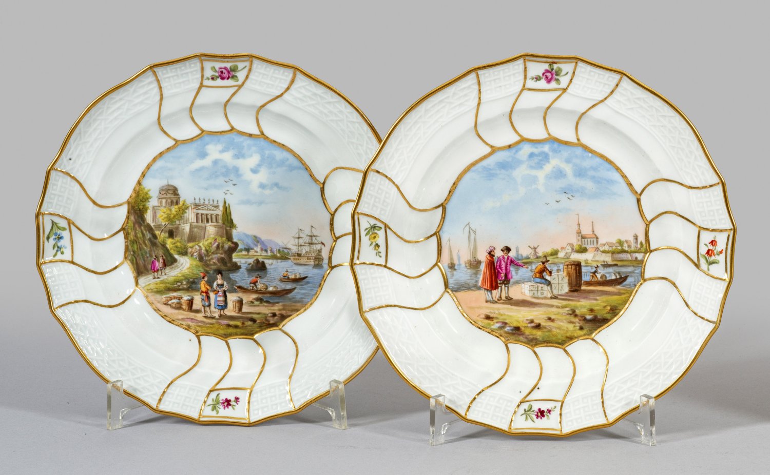 A pair of plates with Kauffahrtei decor. Fire crack. Crossed swords mark.