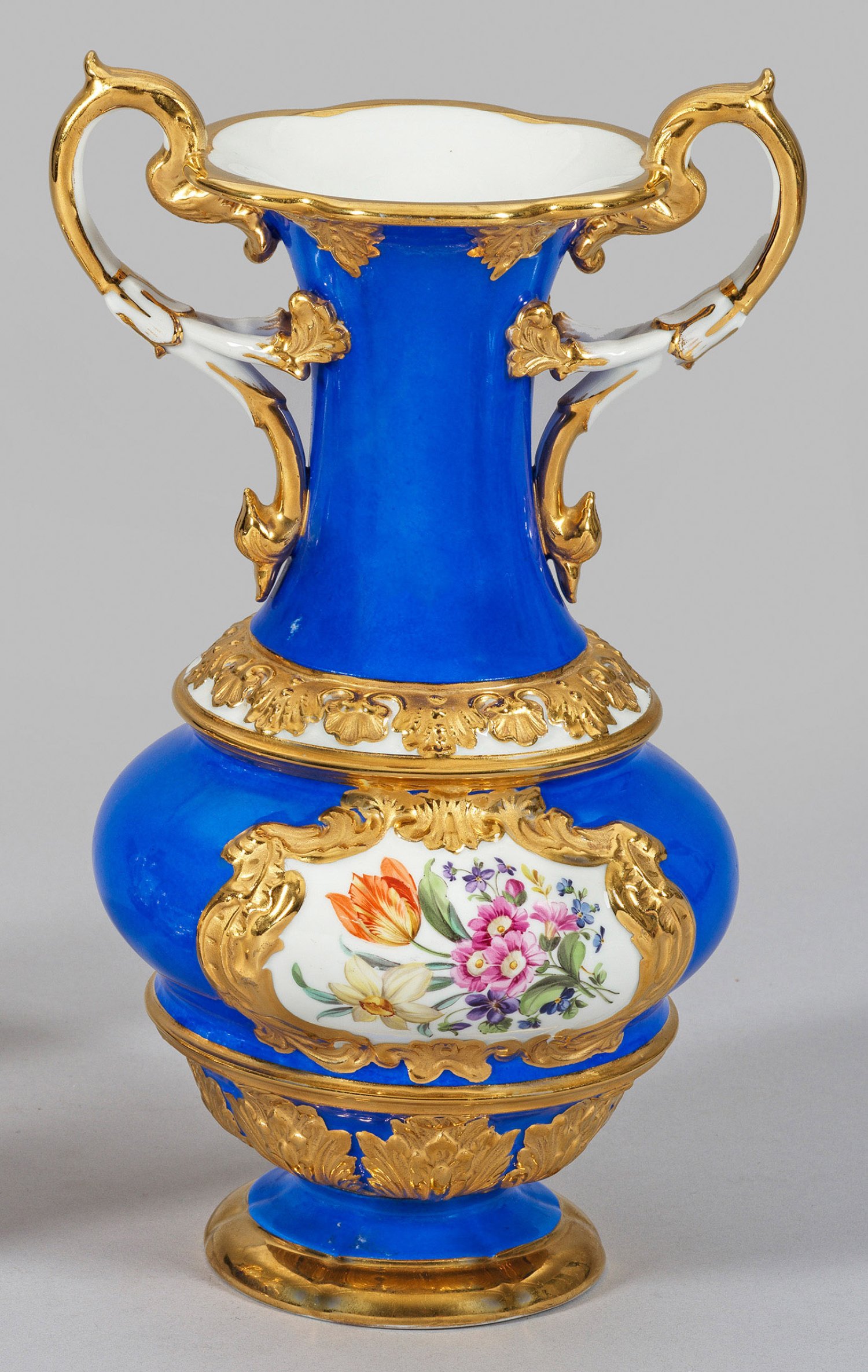 Über dem Rundstand gedrückt balusterförmiger, mehrfach profilierter Korpus in gedrungenen, trompetenfömig ausladenden Hals mit seitlich blattreliefierten Volutenhenkeln übergehend. Lapislazuliblauer Fond. Goldbronzierte Reliefgoldbordüren- und beidseitige Kartuschen mit Blumenbuketts. Polychrome Malerei mit Goldstaffage. Entw. Ernst August Leuteritz. Schwertermarke. H. 32 cm.