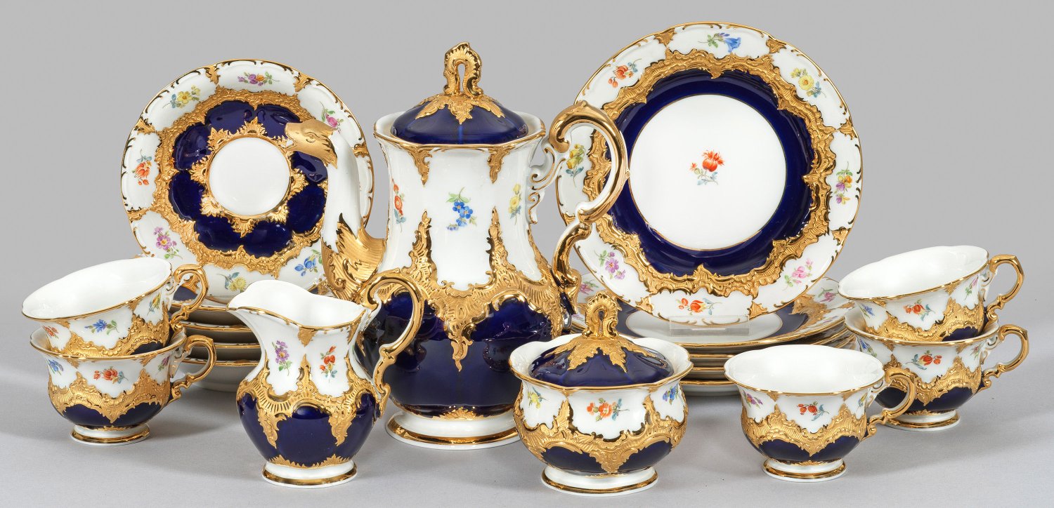 13-tlg.; Mokkakanne, Sahnegießer, Zuckerdose, 5 Mokkatassen mit Untertassen, 5 Kuchenteller. Gebauchte Form mit c-förmig geschwungenen Volutenhenkeln. sog. "B-Form". Auf der Wandung und im Spiegel prächtiger Dekor aus reliefierten Rocaillebordüren in sog. Goldbronze als Rahmung für kobaltblaue bzw. weiße Fondflächen. Streublumendekor in polychromer Malerei. Entw. Ernst August Leuteritz. Kanne minim. best.; Schwertermarke. Kannen-H. 20 cm, Teller-D. 16 cm.
