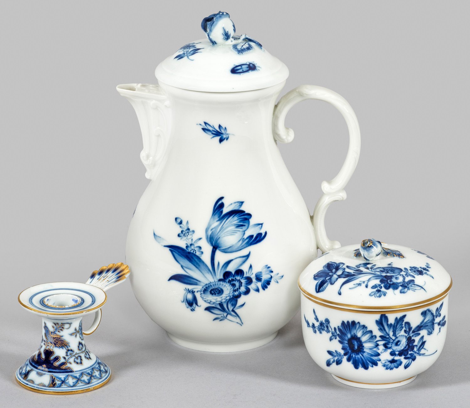 3-tlg.; Kaffekanne, Zuckerdose und Kerzenhalter. Deckelknäufe in Form plastisch aufgelegter Rosenknospen. Dekor „Deutsche Blume und Insekten“ und "Indisches Vogelmodell" in unterglasurblauer Malerei, teilw. mit Goldstaffage. Deckelknäufe minim. best.; Gold ber.; Schwertermarke. Kannen-H. 23,5 cm.