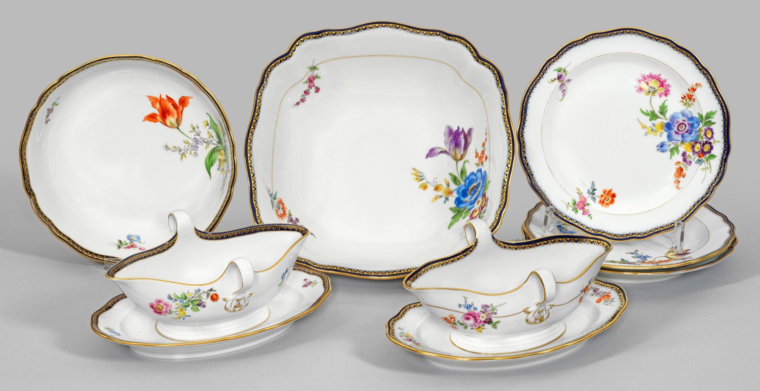 7-tlg.; Beilagen- und Anbietschale, 2 Saucieren, 3 Dessertteller. Form "Neuer Ausschnitt" mit passig geschweiftem Rand. Dekor "Deutsche Blume" in polychromer Malerei. Umlaufender Golddekorrand, sog. Wiener Kante auf kobaltblauem Fond. Ein Henkel mit Haarriss. Schwertermarke. Teller-D. 21,5 cm, Schalen-D.25 cm - 27 cm.