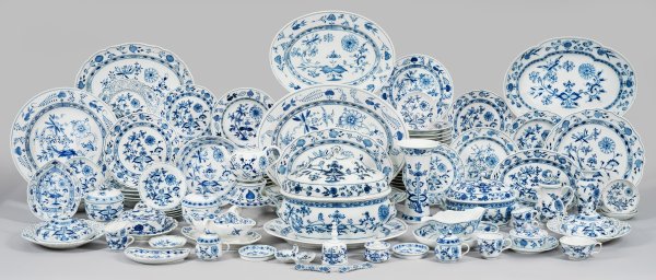 131-tlg.; Tee- und Mokkakanne, Tee-, Kaffee- und 4 Mokkatassen mit Untertassen, 2 Schokoladentassen, Stövchen, 2 Zucker- und 2 Butterdosen, 8 Anbiet- und 2 Bratenplatten, 2 Saucieren, kleine und große Terrine, Blatt-, Nieren- und Anbietschale, Saliere, 35 Speise-, 15 Suppen-, 16 Dessert- und 4 Brotteller sowie 2 Speise-, 8 Dessert- und 10 Kuchenteller mit Rand in Ajour, Essigkanne, Vase, Tintenfass, Tischglocke, 2 Messerbänkchen, 2 Untersetzer. Unterglasurblauer Zwiebelmusterdekor. Teilw. ber./best./rest., 3 Objekte mit Haarriss. Beigabe: 4 Untertassen, 2 Deckel. Schwertermarke. Zeptermarke. Platten-L. 29 cm - 48 cm.