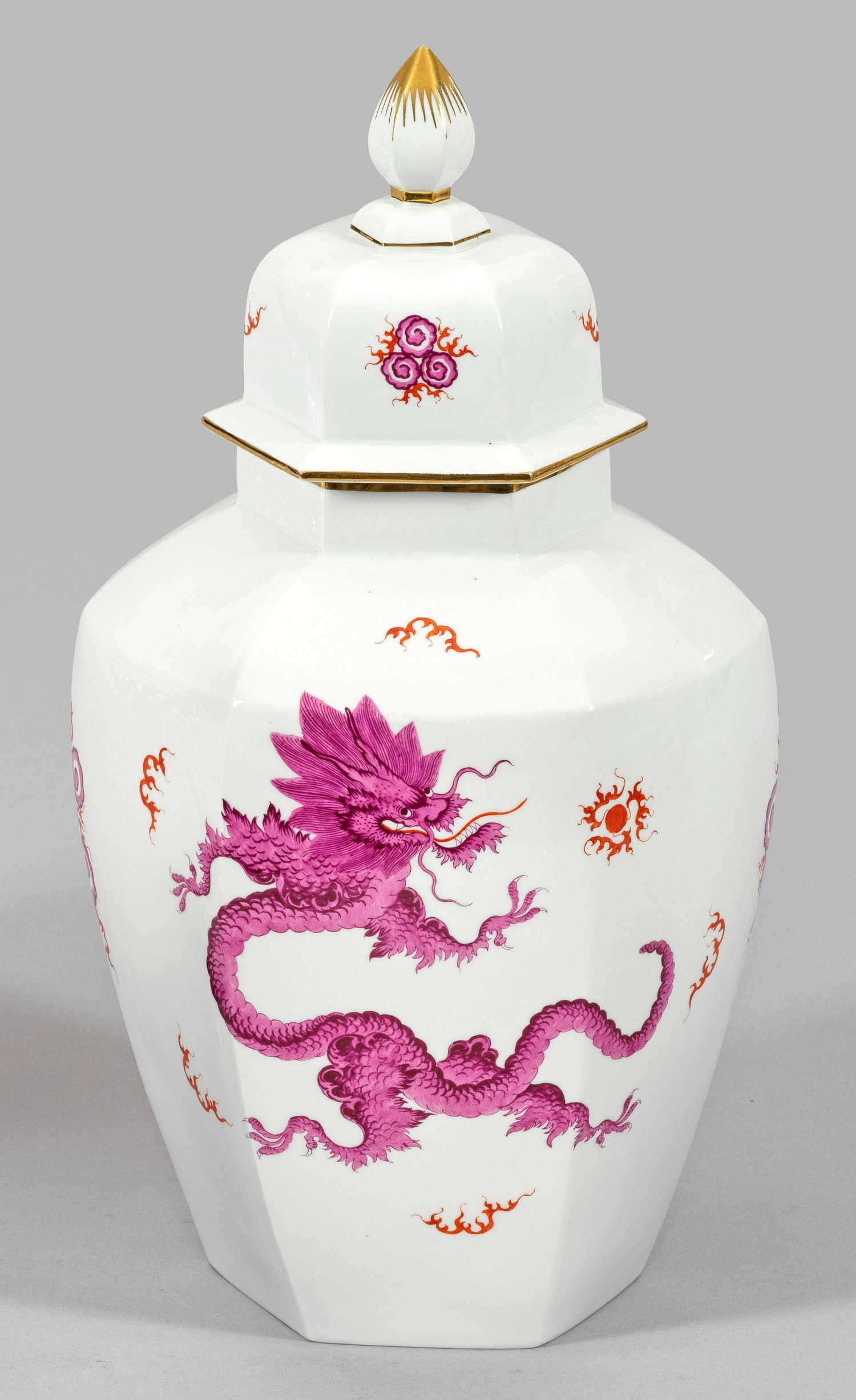 Balusterförmiger, sechsseitig gekanteter Korpus mit eingezogener Schulter und kurzem Hals. Korrespondierender, überkragender Deckel mit Spitzknauf. Auf der Wandung großer, vierklauiger, chinesischer Drache zwischen geflammten Perlen sowie Wolken- und Flammensymbolen. Polychrome Malerei in Violetttönen mit Rot. Goldstaffage. Schwertermarke. H. 44 cm.