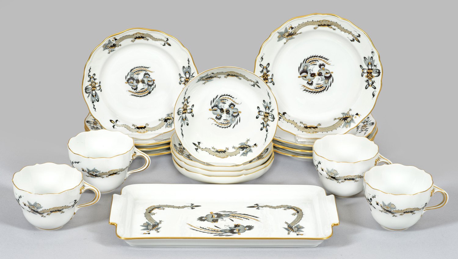 13-tlg.; 4 Kaffeetassen mit Untertassen, 4 Kuchen- und 4 Brotteller, Tablett. Dekor "Schwarzer reicher Drache" in grau-schwarzer und goldgehöhter Malerei. Schwertermarke. Tablett-L. 29 cm.