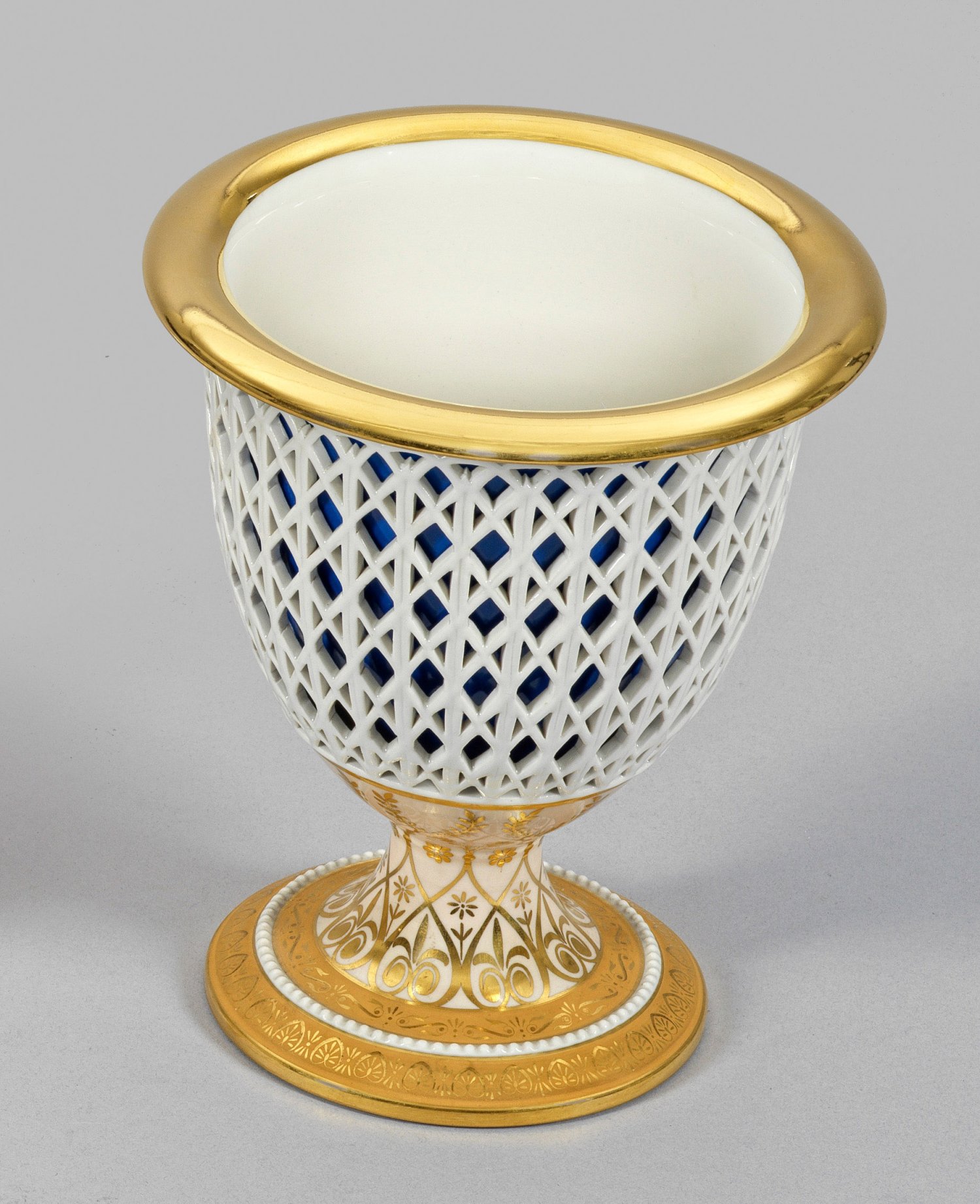 2-tlg.; Tief gemuldeter, gitterartig durchbrochen gearbeiteter Korpus mit Perlfries, partiell apricotfarbenem Fond und ornamentaler Goldstaffage sowie Gefäßeinsatz mit königsblauem Fond und breitem Goldrand. Entw. Johann Carl Friedrich Riese nach Karl Friedrich Schinkel. Zepter- und Malereimarke. H. 18 cm. D. 13,5 cm.