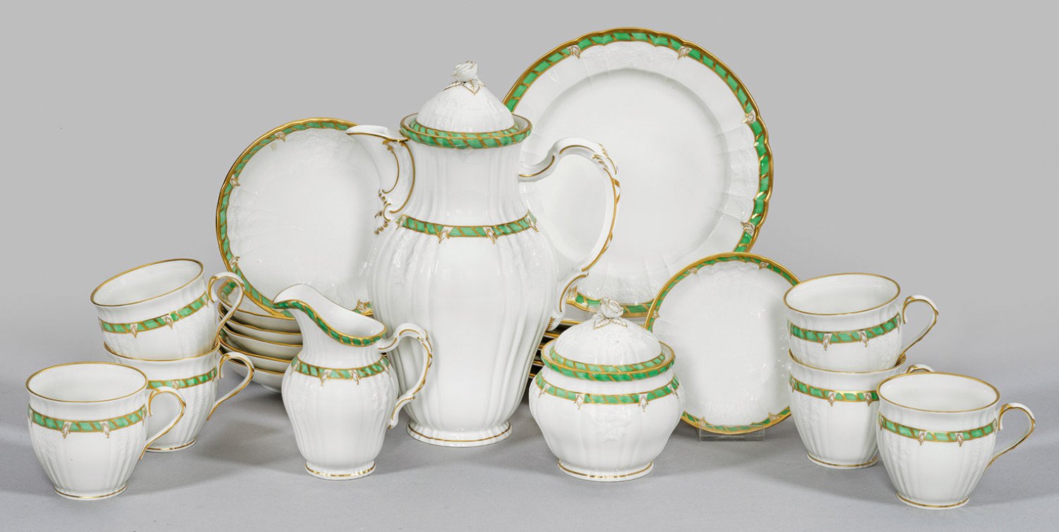 16-tlg.; Kaffeekanne, Zuckerdose, Sahnegießer, 6 Tassen mit Untertassen, 6 Kuchenteller, Konfekttellerchen. Reliefdekor "Rocaille" mit grün staffiertem Band und reicher Goldstaffage. Zepter- und Malereimarke. Kannen-H. 24 cm.