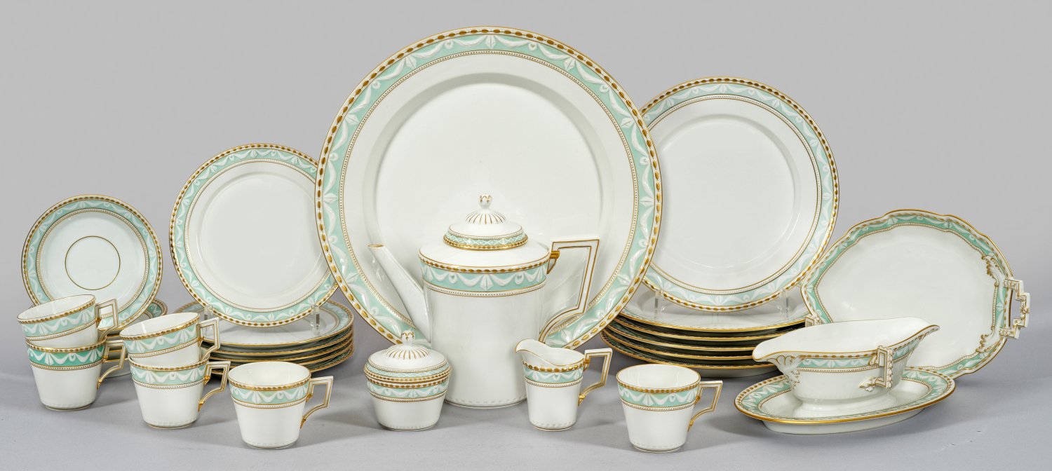 für 6 Personen. 24-tlg.; Kaffeekanne, Sahnegießer, Zuckerdose, 6 Kaffeetassen mit Untertassen, 6 Kuchenteller, Konfektschale in Blattform, 6 Speiseteller, Sauciere, große runde Platte. Auf Wandung, Deckel und Fahne umlaufend feine Bordüre mit reliefierten Perlstäben und Tuchgehänge vor seegrünen Fond. Goldstaffage. Sahnegießer best., ein Unterteller mit Riss, teilw. minim. ber.; Zepter- und Malereimarke. Kannen-H. 22 cm. Platten-D. 36,5 cm.