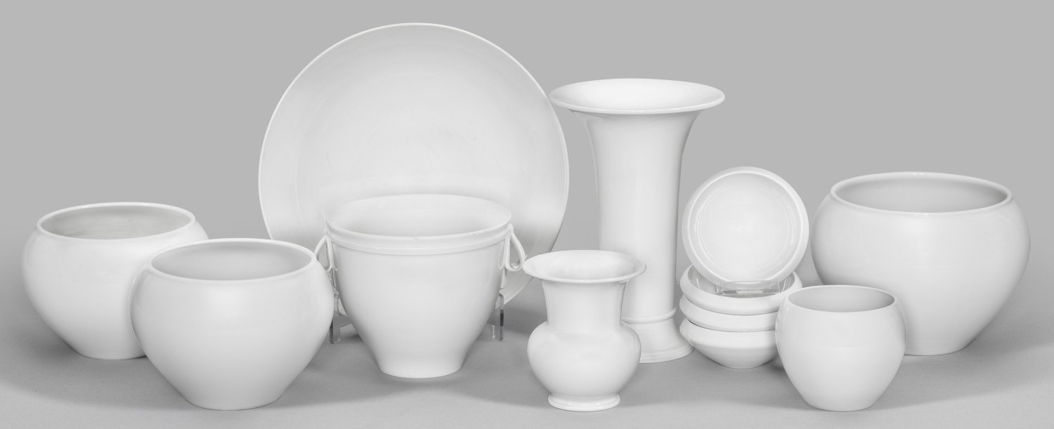 12-tlg.; 7 Vasen, 4 Zierschalen, Obstschale. Runde Grundform, glatte Wandung. Bauchig, konisch oder mit Trompetenrand. Teils profiliert oder mit Henkeln. 2 Objekte best.; teilw. innenseitig Gebrauchsspuren. Zeptermarke. Obstschalen-D. 23,5 cm.
