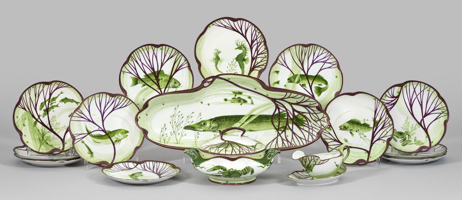 15-tlg.; Große Platte, Kartoffelnapf, Sauciere und 12 Speiseteller. Ovale, runde, gedrückt kugelige, teilw. durchbrochen gearbeitete, passig geschweifte Körper mit Fischkopfhandhaben und Algengriff. Im Spiegel verschiedene, zwischen den sich vom Rand ornamental ausgeprägten Wasserpflanzen, schwimmende Fische und Meerestiere. Darunter Hecht, Hummer, Taschenkrebs, Karpfen, Forelle oder Seepferdchen. Chromgrün, Purpur und goldstaffiert. Entw. Hermann Gradl, um 1899-1900. Bez. "Gesetzlich geschützt". Partiell unw. rest.; Manufakturmarke. Platte 60 cm x 30 cm. Teller D. 23,5 cm.
