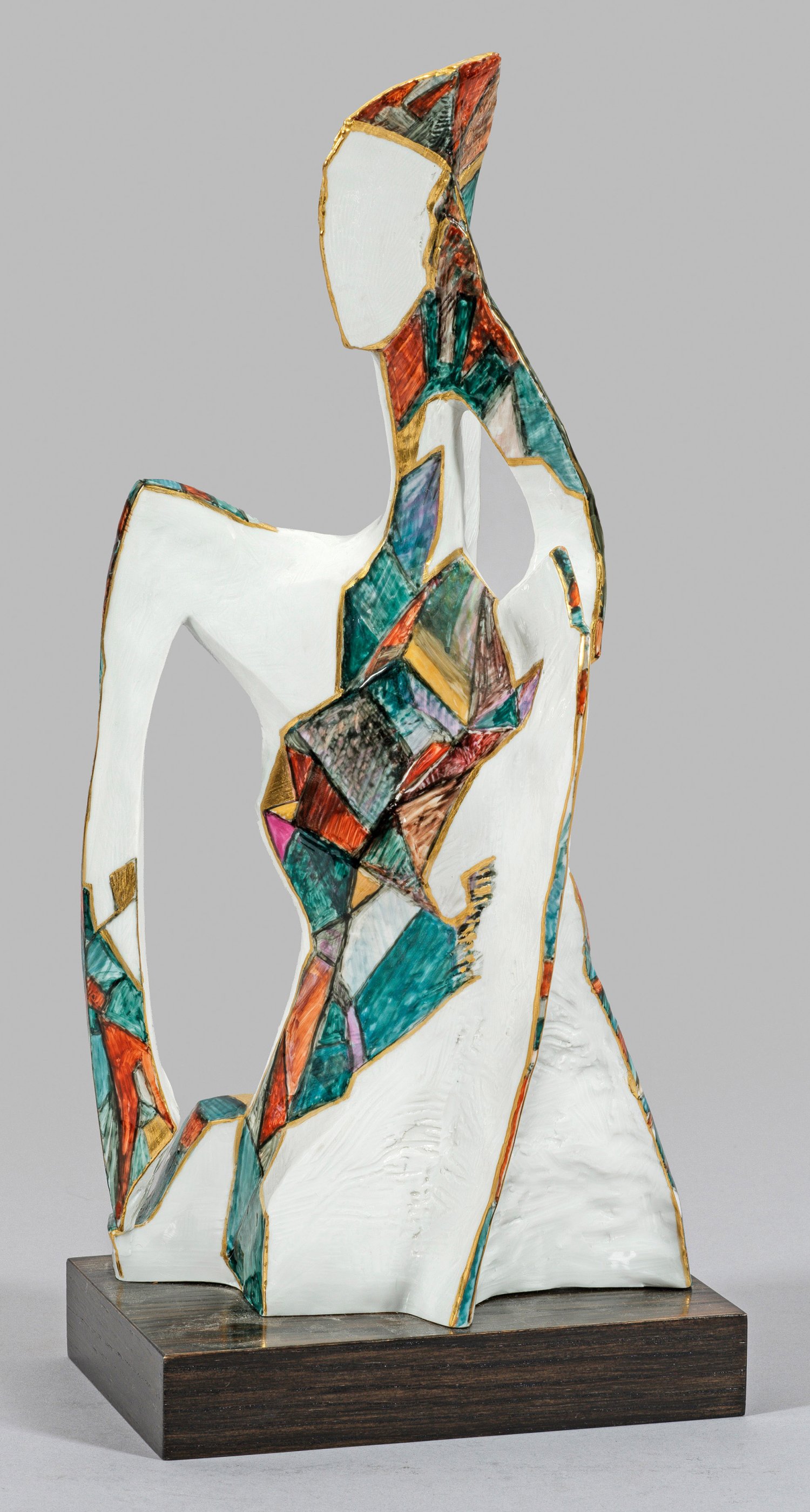 auf rechteckiger Holzbasis abstrakt figurative Darstellung der Columbine. Polychrome Malerei mit Goldkonturierung. Entw. Jörg Danielczyk. Nr. 221/2005. Entw.-Bez.; Schwertermarke. H. 40 cm.