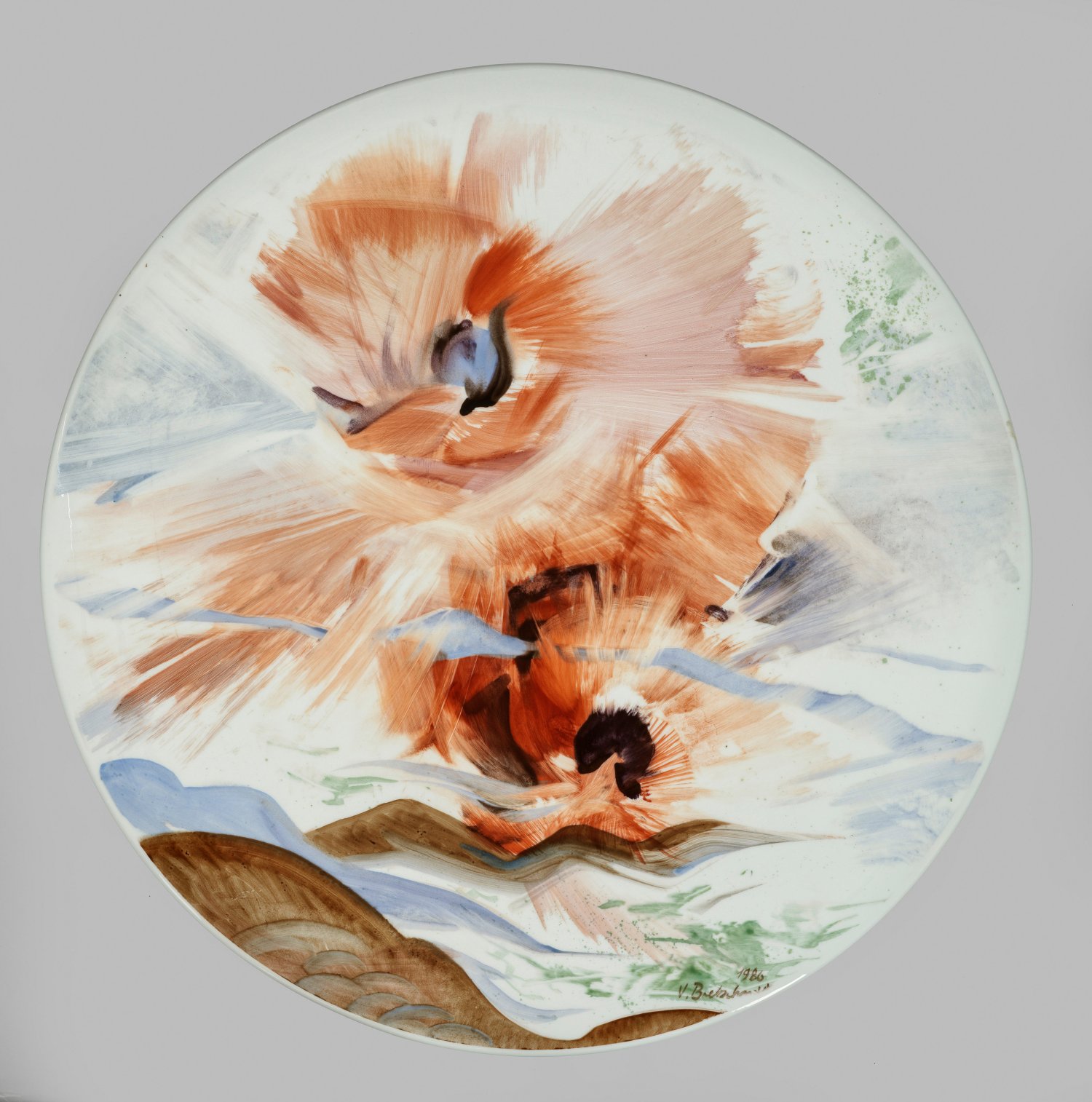 Runde, leicht vertiefte, zum Rand hin ausschwingende Form. Im Spiegel die flächendeckende, lasierend aufgetragene Darstellung voll ausgebildeter Mohnblüten auf abstrakt naturalistisch verlaufendem Fond. In duftig lockerem Duktus polychrom bemalt. Entw. Volkmar Bretschneider. Künstler-Sign. mit Dat. "V. Bretschneider (19) 86" bzw. rücks. "B. (19) 86". Unikat-Nr. 107/86. Schwertermarke. D. 56,5 cm.
