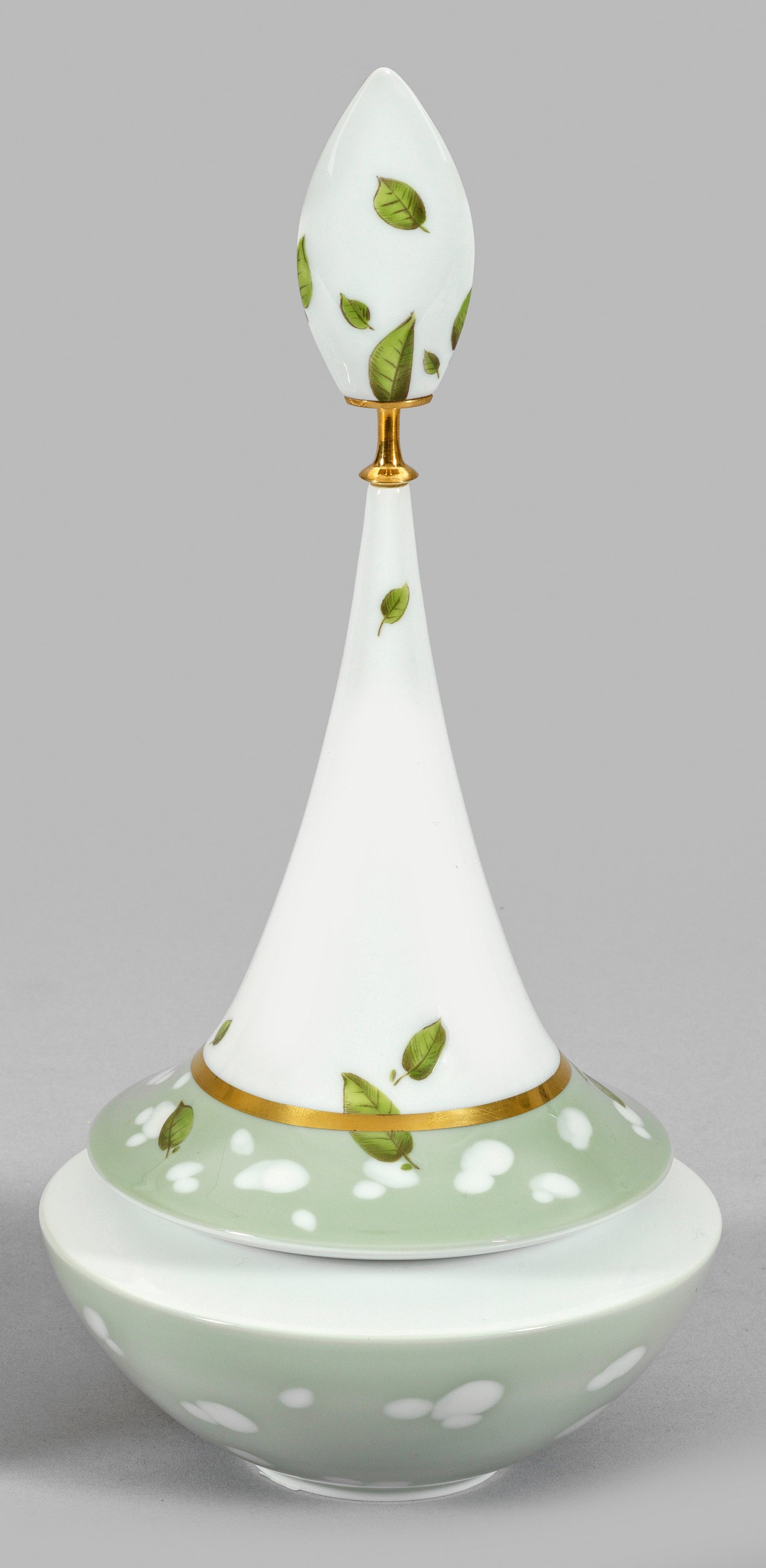 Über dem Rundstand halbkugelig gewölbter Korpus mit passig eingezogener Schulter. Hoher, sich trichterförmig verjüngender Deckel mit stilisierter Blattbekrönung. Lindgrüner Fond mit wolkig weiß belassenen Stellen. Gestreute Blätter. Polychrome Malerei mit Goldstaffage. Entw. von Sabine Wachs und Silvia Klöde, 2005 Dekor-Entw. Andreas Herten. Aus der Kollektion "Limitierte Meisterwerke". Limitierung 016/100. Modell-Nr. 52727. Jahreszeichen. Schwertermarke mit Goldsignet. H. 30 cm.