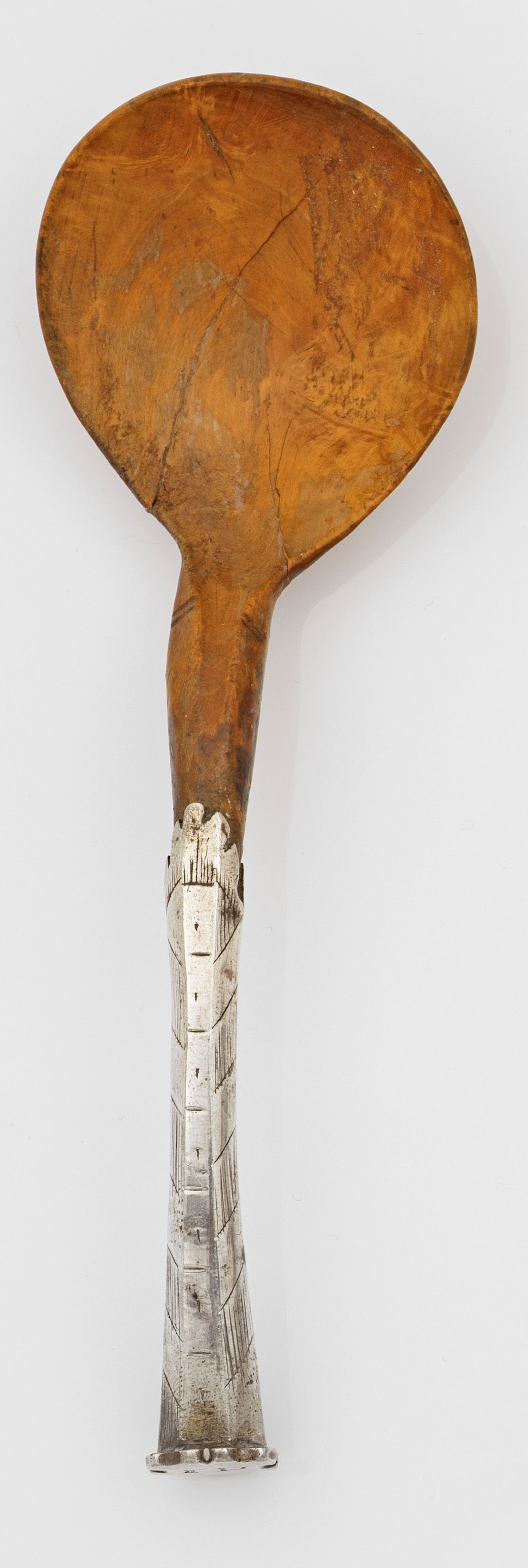 Silber und Wurzelholz. Stark gerundete, vertiefte Laffe aus geschnitztem Holz, in runden Stiel übergehend. Griff mit fünffach gekanteter, durch geometrische Linien ornamentierter Silbermontierung in schildförmigem Knauf endend. Monogr. "IP". Minim. Gebrauchsspuren. Gew. ca. 18 g. L. 15 cm.