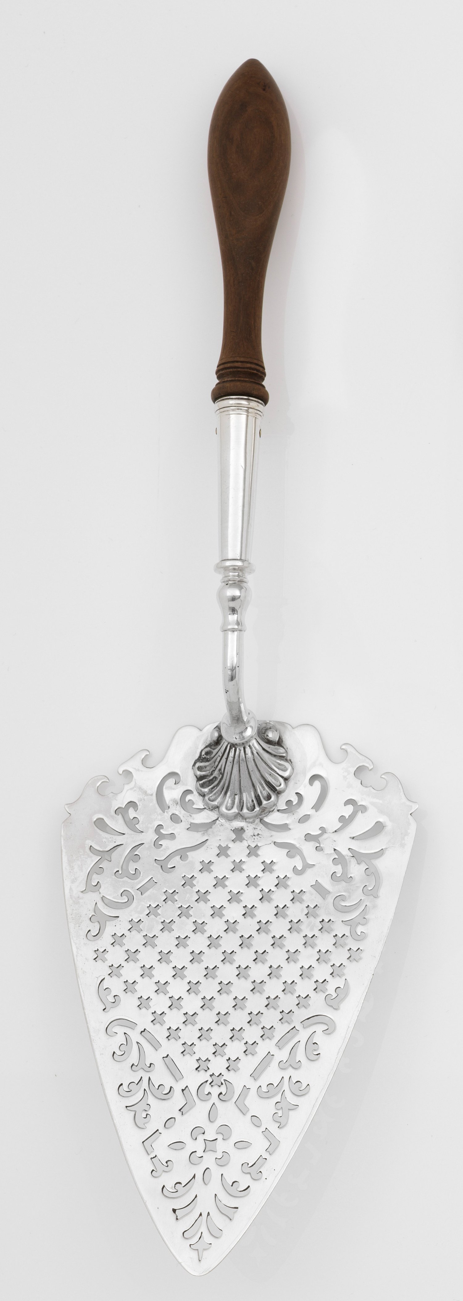 An English silver pastry lifter with wooden handle by James Rood (master since 1710). Assay and maker´s marks.