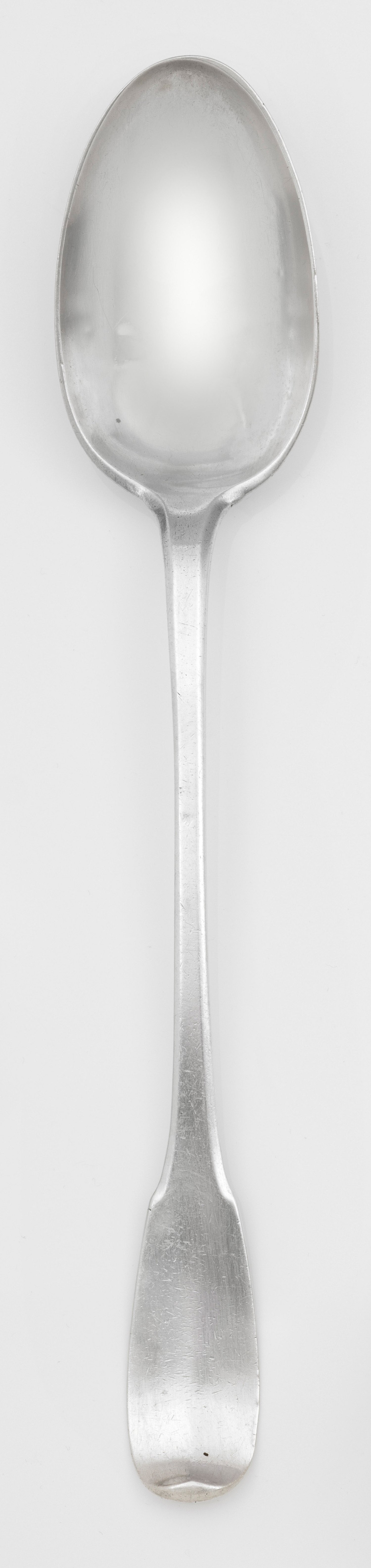 Silber. Ovale Laffe, übergehend in flachen, spatenförmigen Griff mit zart angedeutetem Mittelgrat. Griff unterseitig mit Wappen mit Grafenkrone und Kessel graviert. Gem., Beschau- und unidentifiziertes Herstellerzeichen. Gew. ca. 145 g. L. 31 cm.