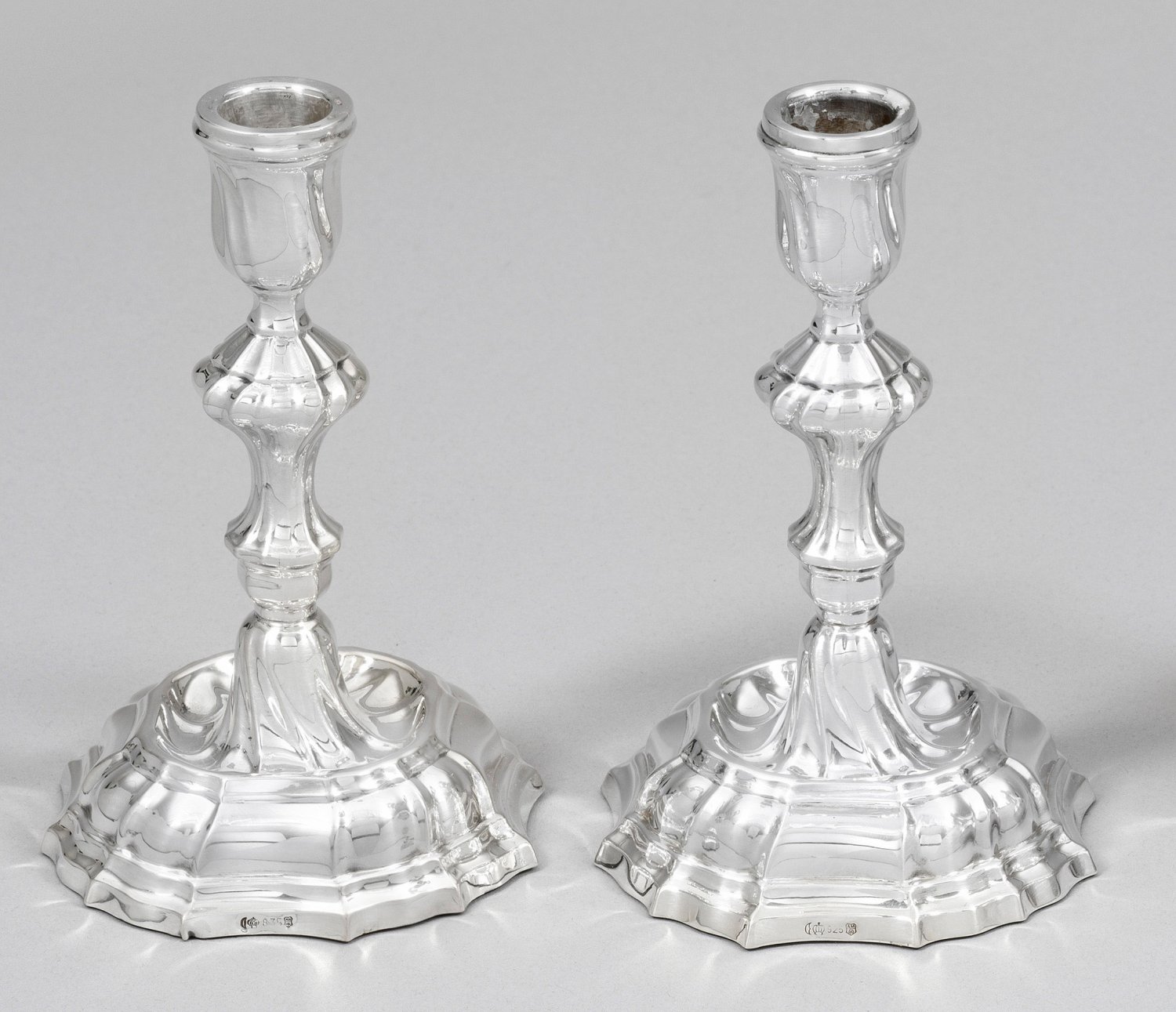 A pair of German Baroque style weighted Sterling silver candlesticks. Standard mark 925. Assay- and maker´s mark.