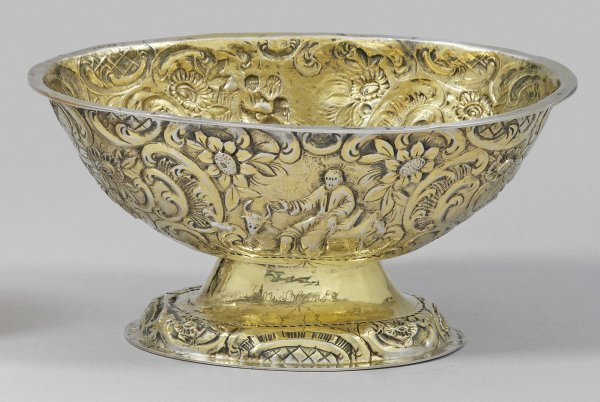 Silber, vergoldet. Ovaler, aufgewölbter Fuß, übergehend in kurzen Schaft und schiffchenförmige, tief gemuldete Schale. Fuß umzogen von Rocaillen, C-Schwüngen, Blüten und Gitterwerk. Korpus mit Darstellung eines Evangelisten mit Attribut. Stand mit punzierter Inschrift "Jan Sybrand" dat. 1808. Alters- und Gebrauchsspuren, rest.; Undeutlich gest.; Gew. ca. 175 g. H. 9 cm. 18 cm x 13 cm.