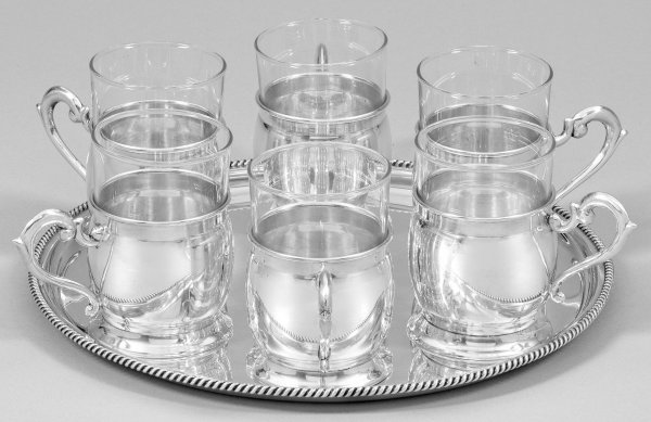 A German 7 piece silver tea service with 6 glasses and a tray. Glasses: Standard mark 999. Assay- and unidentified maker´s mark. Tray: Standard mark 800. Assay- and maker´s mark.
